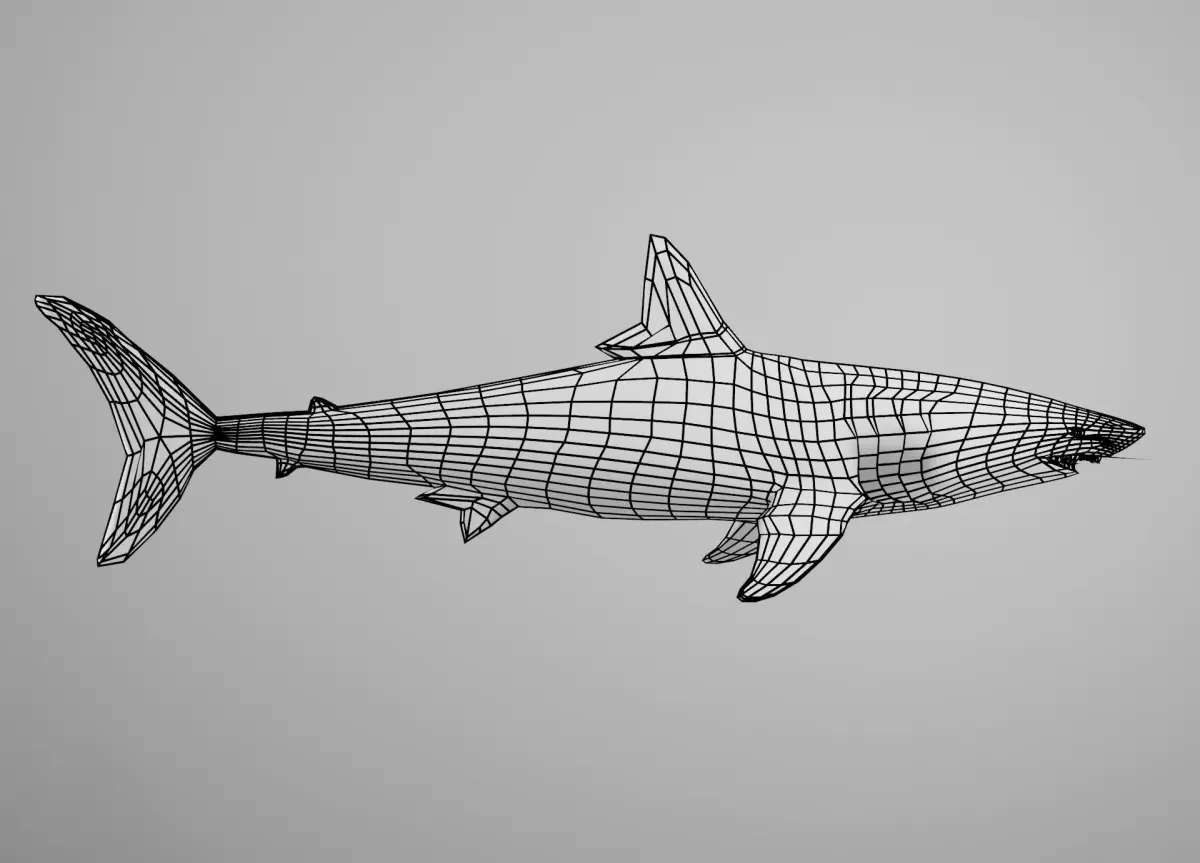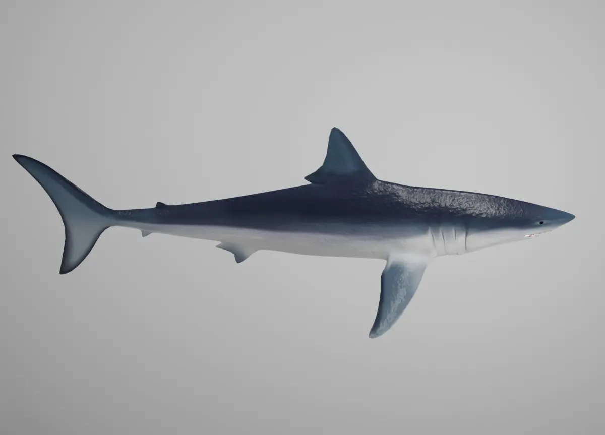 Rigged and animated, lowpoly Mako Shark model. Model file can be used as-is or with subdivision; textured turntable preview images are of the model with one level of subdivision applied. Also included in the preview images are the non-subdivided model with visible wireframe. Sculpted in Blender, UV unwrapped.