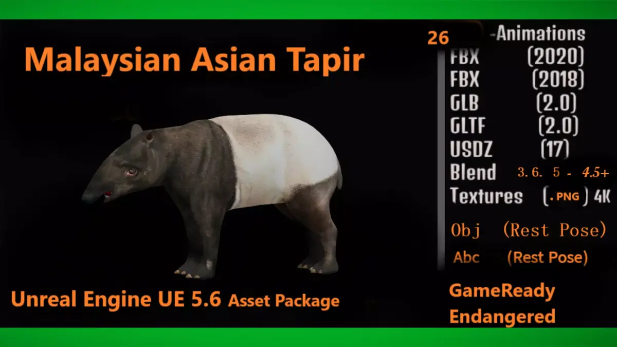The Malayan tapir, also called Asian tapir, Asiatic tapir, oriental tapir, Indian tapir, piebald tapir, or black-and-white tapir, is the only living tapir species outside of the Americas. It is native to Southeast Asia from the Malay Peninsula to Sumatra.. .3D Asian Malaysian Tapir Realistic Animal Model By Nyilonelycompany (nyc).Thank you.