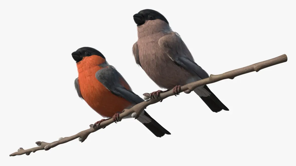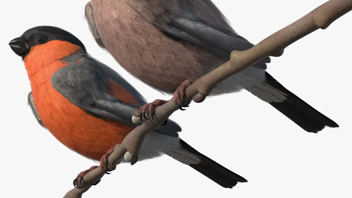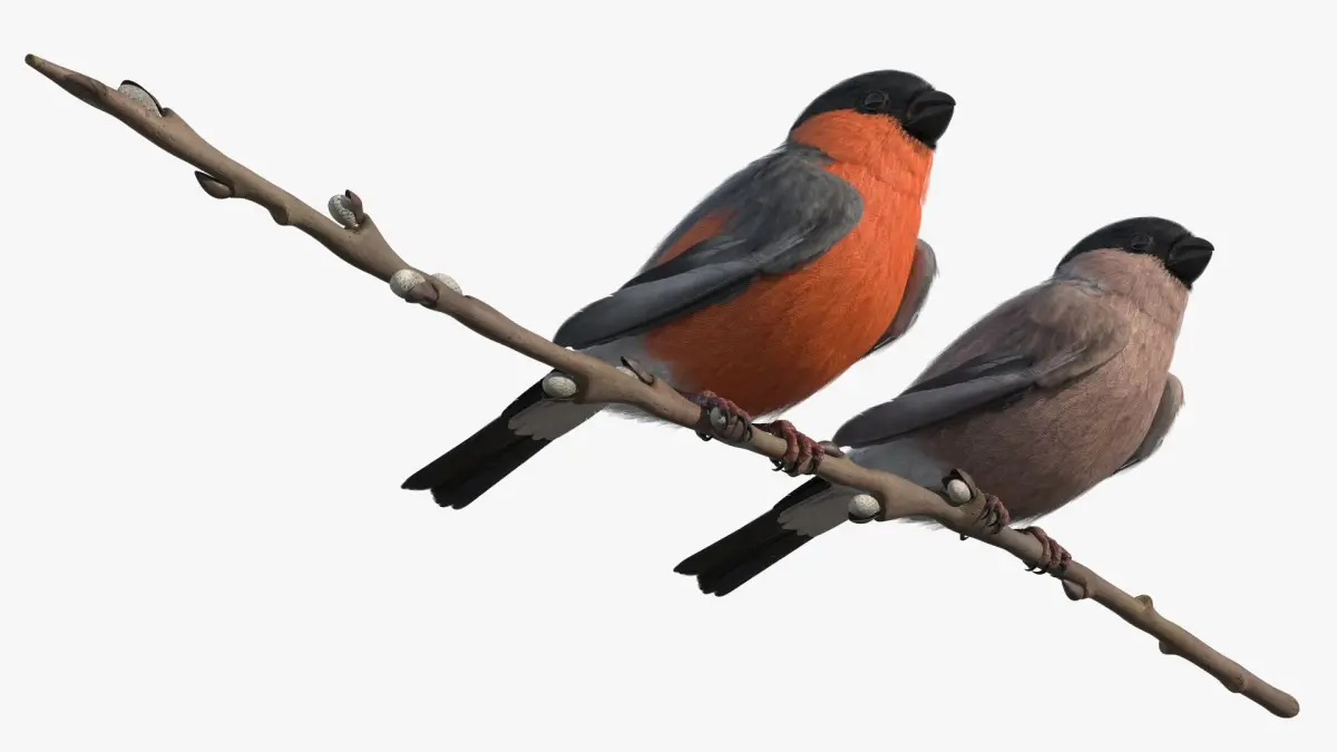 Male and Female Bullfinch Birds on Branch is a three-dimensional model of pair of Eurasian bullfinches (Pyrrhula pyrrhula), that are small passerine birds from the finch family Fringillidae.