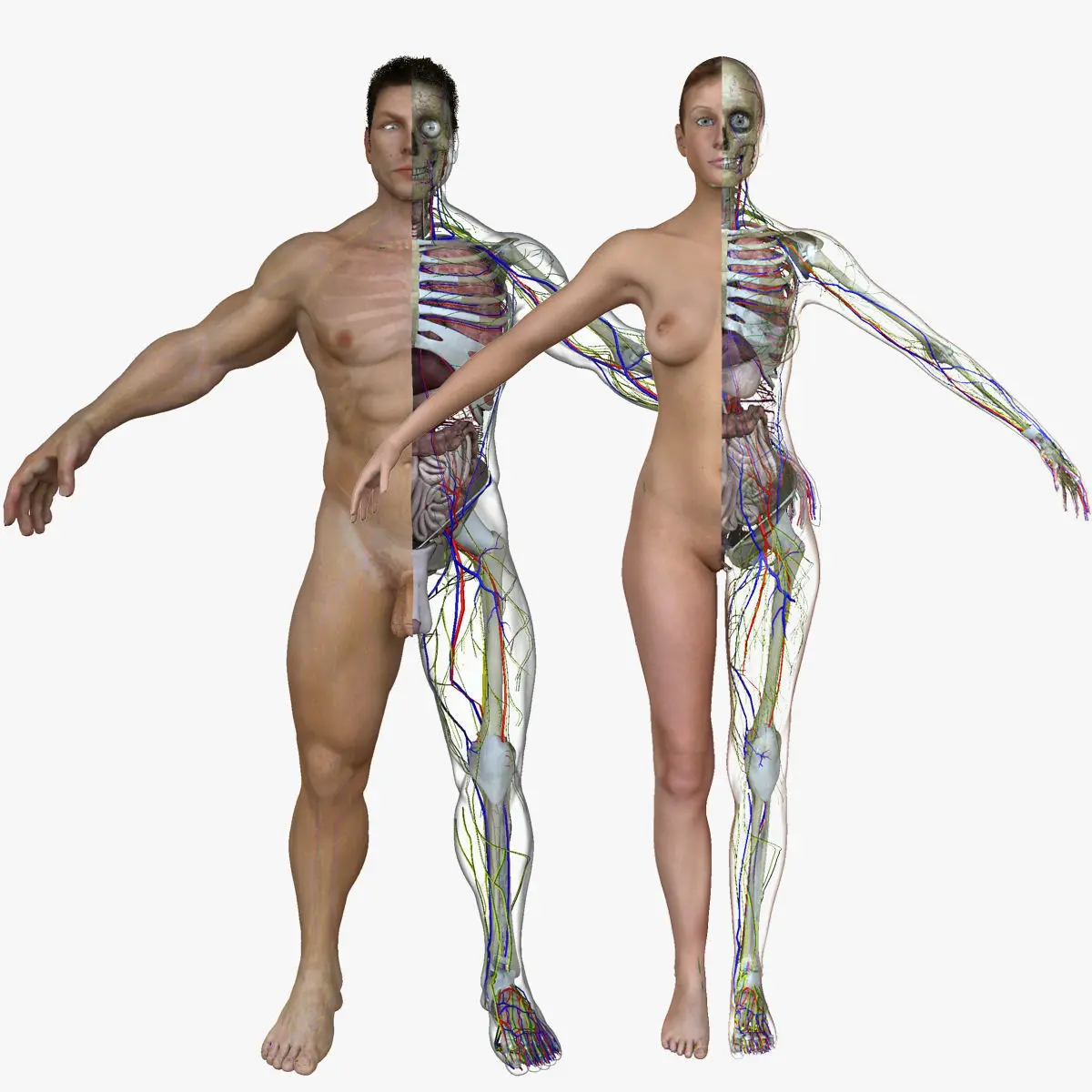 ==RIGGED FEATURES==-Transparency sliders allow custom levels of transparency per system.-All systems can be toggle on or off.-Every object is select-able and named / grouped properly for easy organization-Several x-Ray Body shaders can be toggled on or off to see how the skin is positioned over the bones.-Real World Scale male (H:190cm, W: 190cm, D:37cm) (6.25 ft tall), female (5 ft 10 inches)-Realistic Textures-Clean edge-loop based topology (no n-gons, minimal triangles)-Built-in control sliders allow for model to be rotated 360 degrees without disrupting lighting.-Male genitals can be toggled on or off-Light set up ready to Render-Note: Characters themselves are not rigged, just the view controls