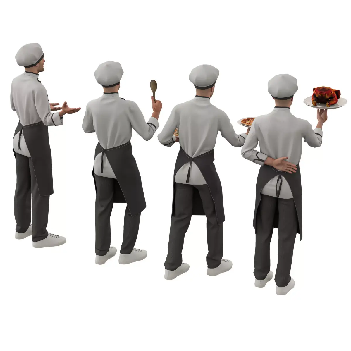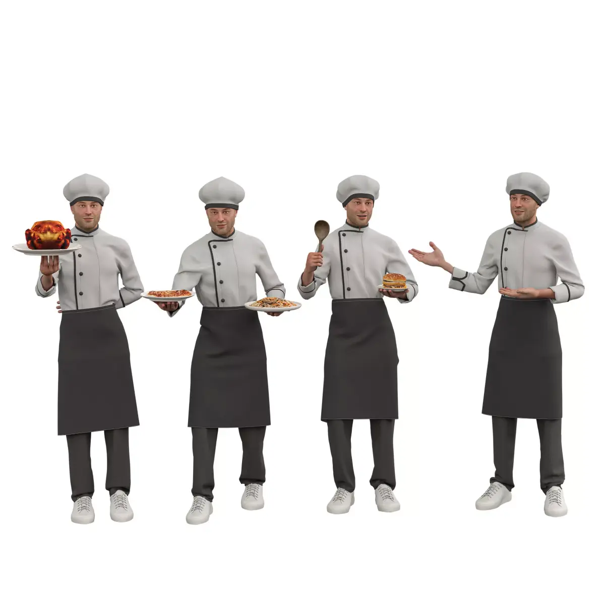 Realistic Design: The chef is fully detailed, from the uniform to the facial features, ensuring a lifelike appearance.Dynamic Poses: Four versatile poses—holding a roasted chicken, a plate of spaghetti, a burger, and gesturing with a ladle—provide flexibility for various culinary scenes.High-Quality Detailing: Meticulously crafted to ensure realistic textures and refined details, from the fabric of the uniform to the food items.Optimized for Rendering: Compatible with Blender, Unreal Engine, Unity, and 3ds Max for seamless integration into your workflow.