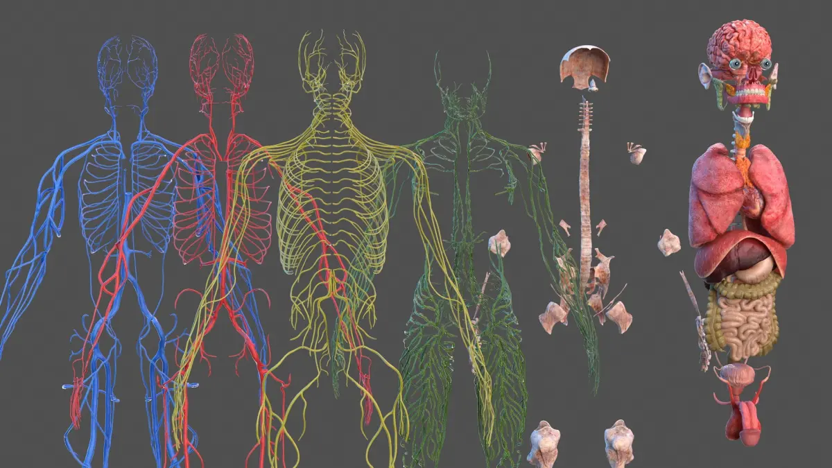 Collection of full body anatomy visual educational materials with respiratory system, digestive system, reproductive system, urinary system, nervous system, blood vessels and cardiovascular system, muscular system, and skinned full body male person anatomical visual educational material.