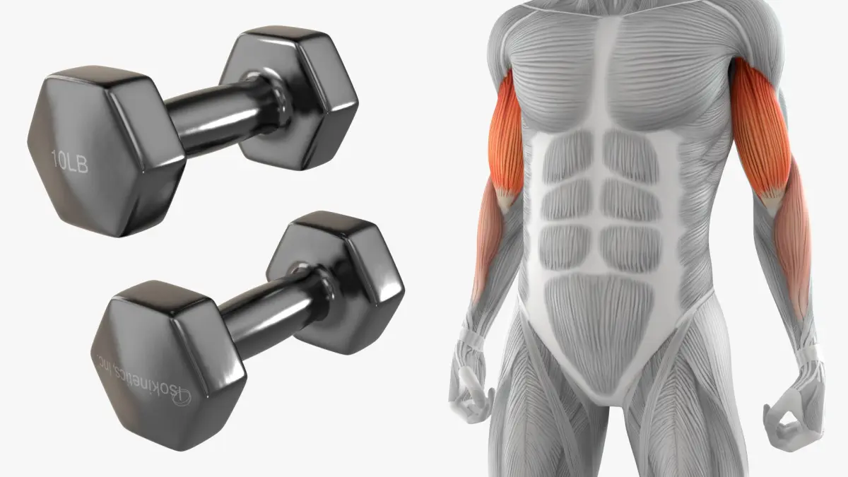 This model showcases detailed anatomical features, emphasizing the muscles activated during a bicep curl, particularly focusing on the biceps brachii. It's designed with precision to aid in the understanding of muscle movement and function, providing a clear visual guide for exercise physiology and workout techniques.