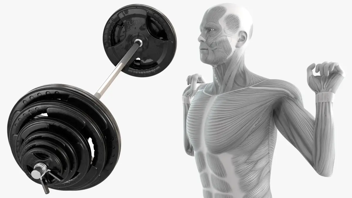 This model illustrates a human figure demonstrating proper form in holding a barbell. The muscles actively engaged during the exercise are highlighted, showing the strain and effort required during the weightlifting process. The detailed anatomy and realistic stance make it ideal for educational and fitness-related purposes.