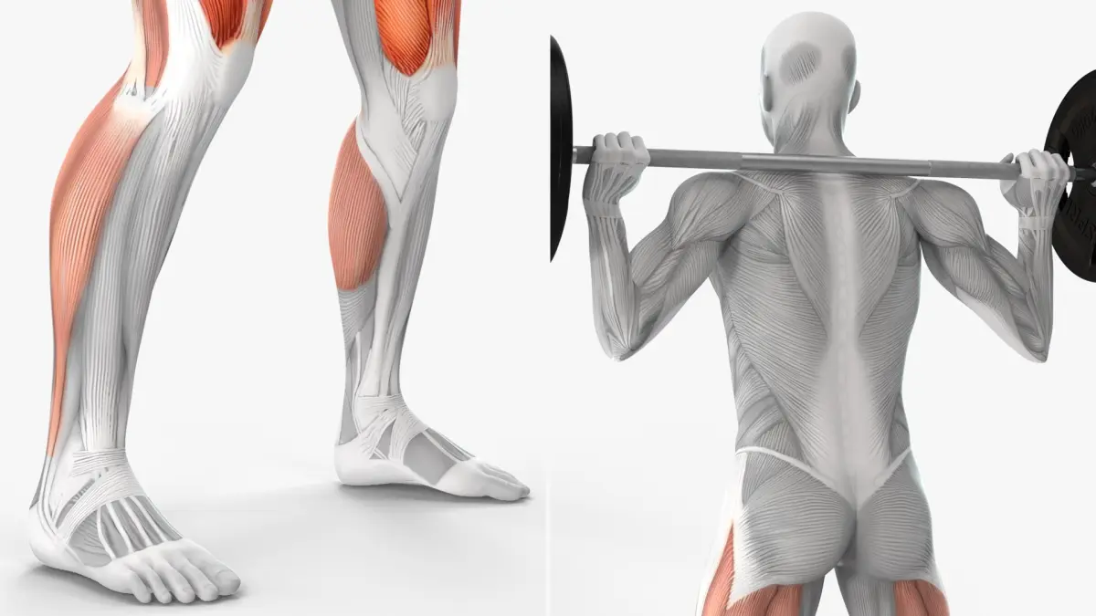 Male Muscular System Anatomy Squats is a three-dimensional model of muscular human figure engaging in a weightlifting activity.