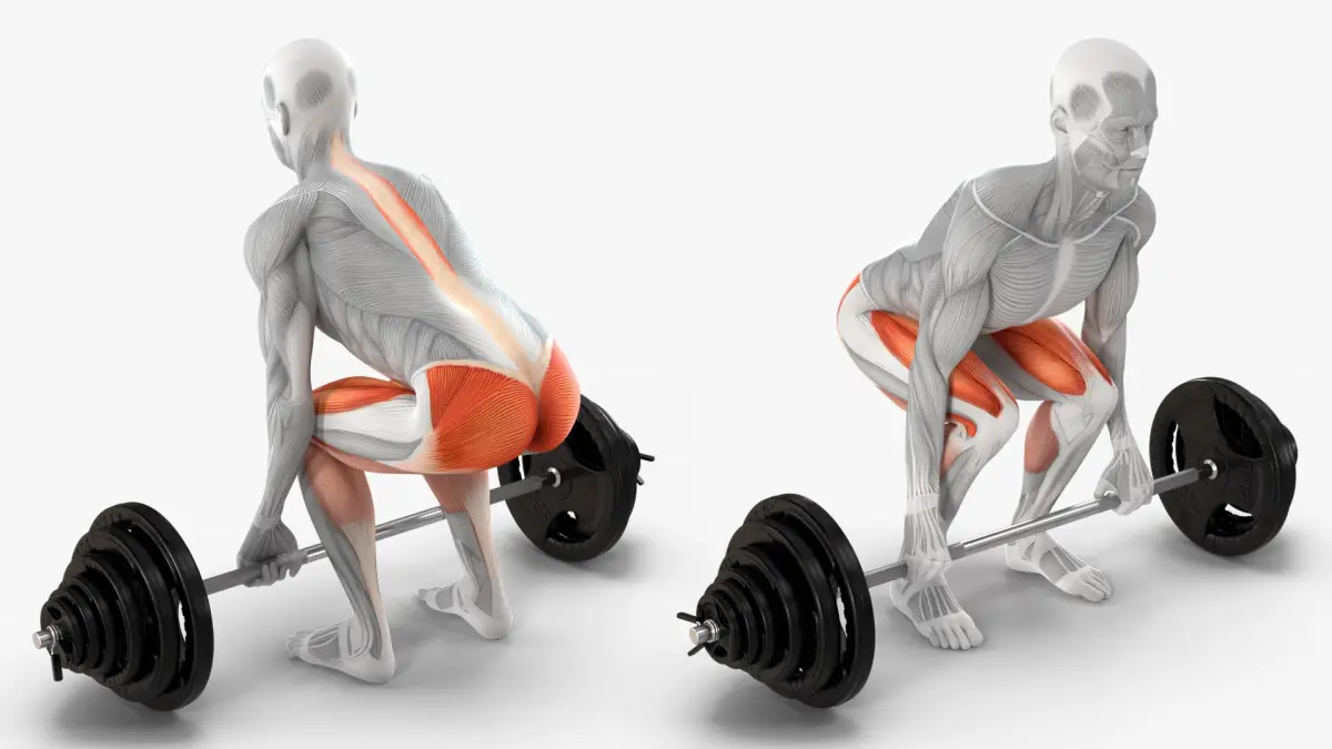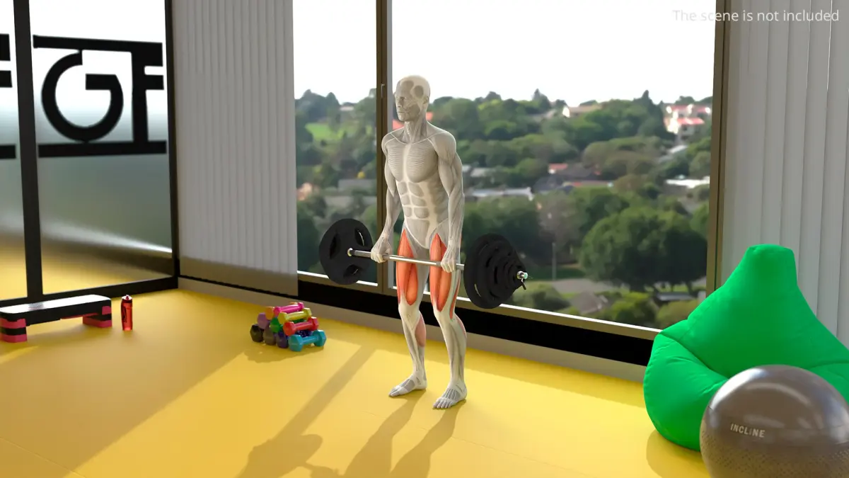 It provides a comprehensive view of proper form and muscle activation, aiding in fitness education and injury prevention. This model highlights the primary muscles engaged during the deadlift, emphasizing the hamstrings, quadriceps, glutes, and lower back.