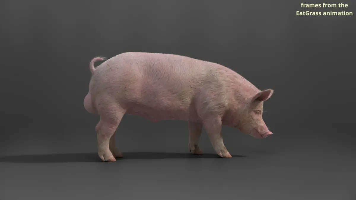 This is a high-quality male large white pig model with multiple 4K textures, fur, rigging, and it's made with Blender and Cycles renderer in a real-world scale. The skin texture and the hair texture are made separately for realism.