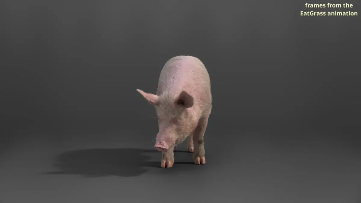 This is a high-quality male large white pig model with multiple 4K textures, fur, rigging, and animations, and it's made with Blender and Cycles renderer in a real-world scale. The skin texture and the hair texture are made separately for realism. Besides, 4 loopable animations and 3 unlooped animations are available.