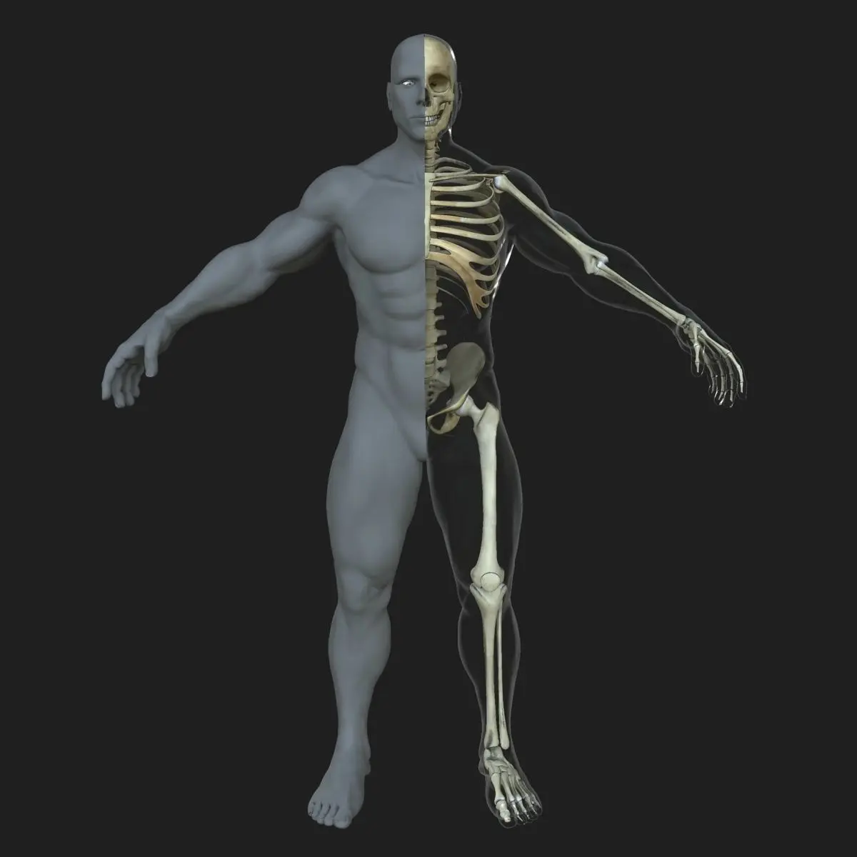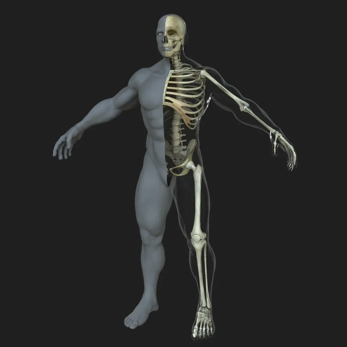 ==FEATURES==-X-Ray Shader and half Skin (Ready to render exactly as shown)-Each bone is select-able and named / grouped properly for easy organization-Real World Scale (6 feet 2 inches, 1.89 meters, 74.6 inches)-Displacement map for extreme detail-Clean edge-loop based topology-Light set up ready to Render