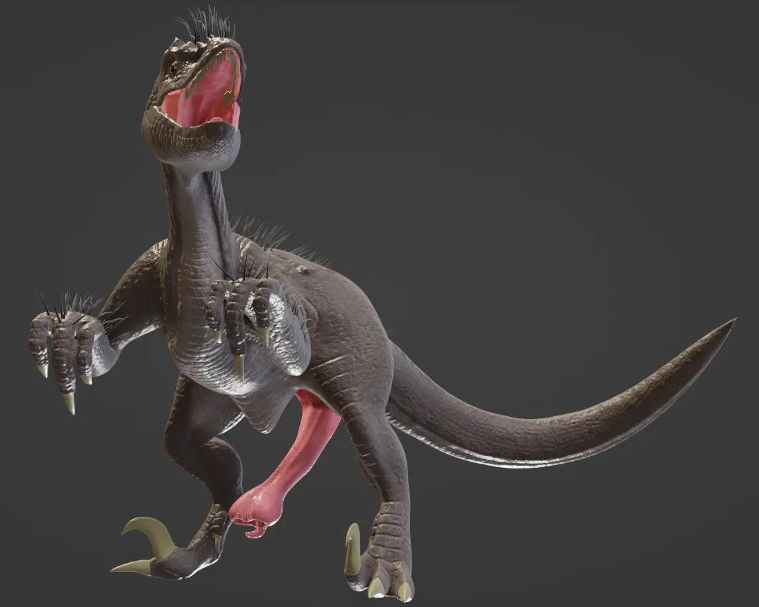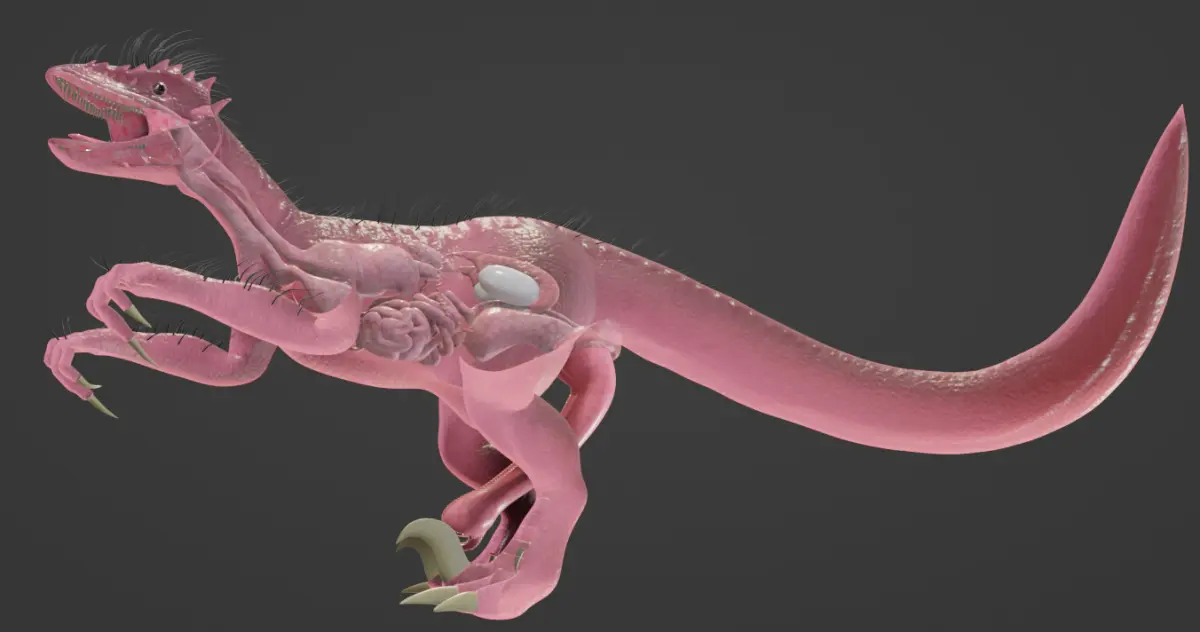 A model of an imagined/fictional male velociraptor created when we first practice using Blender, with some major internal (theorized) systems: digestive system, reproductive system,... some of which can be controlled. There is a Readme.txt included together with the model to show how the control can be performed. You can also adjust the Alpha setting to view the internal anatomy through the dinosaur's translucent skin.