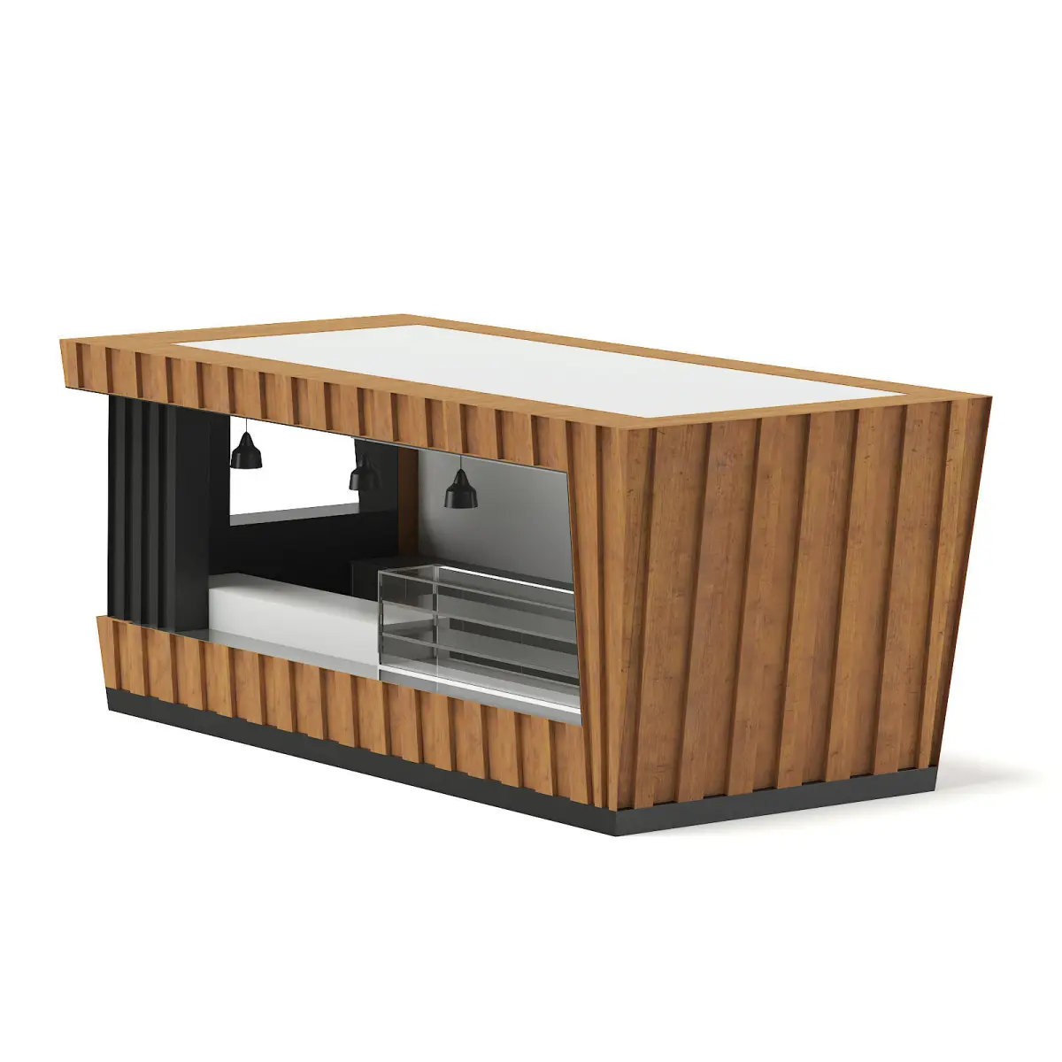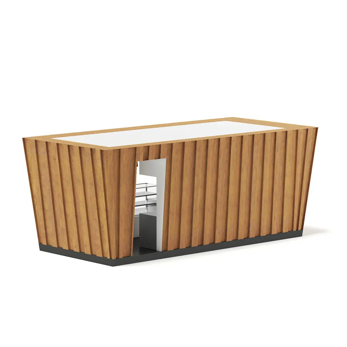 Mall stall 3d model with wooden walls and black elements. Compatible with 3ds max 2010 (V-Ray, Mental Ray, Corona) or higher, Cinema 4D R15 (V-Ray, Advanced Renderer), FBX, OBJ and Unreal Engine.