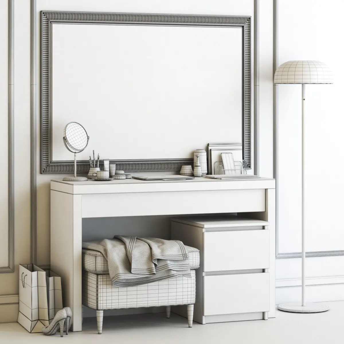 Malm Dressing Table with Songe wall Mirror and Strandmon Gray Ottoman: