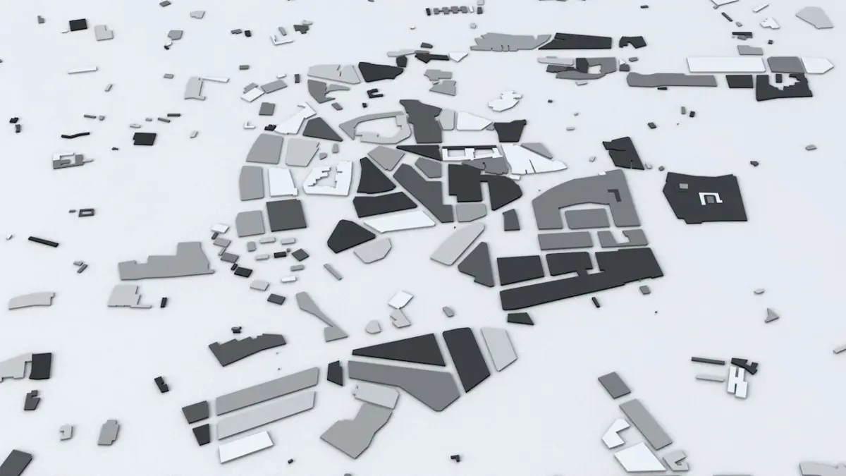 - the model is positioned on a flat surface (all buildings are on the “floor” - no elevation data included)