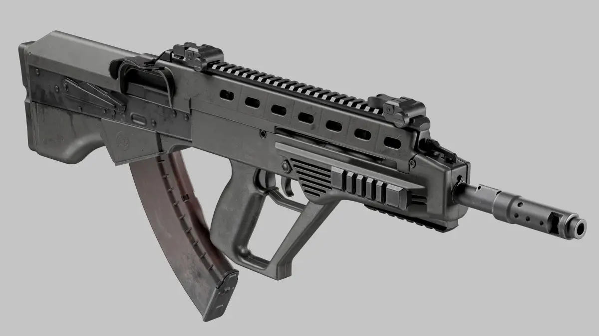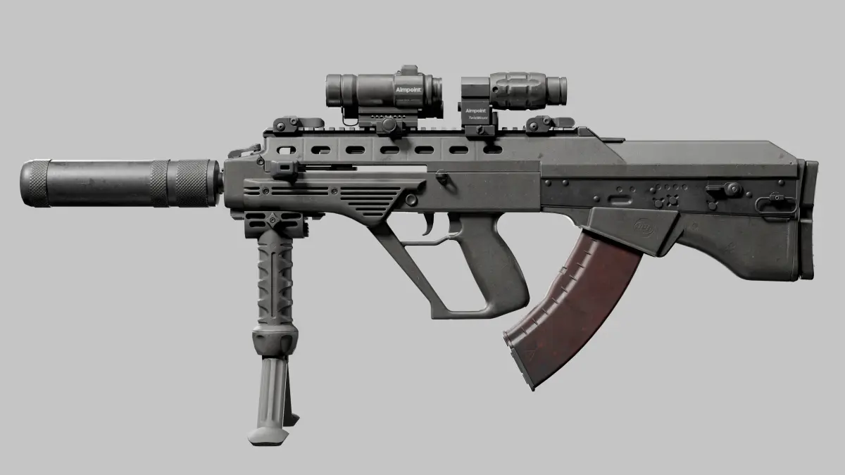 This is a Vulkan M or Malyuk Assault Rifle, a deeply modified Kalashnikov assault rifle with a bullpup layout.