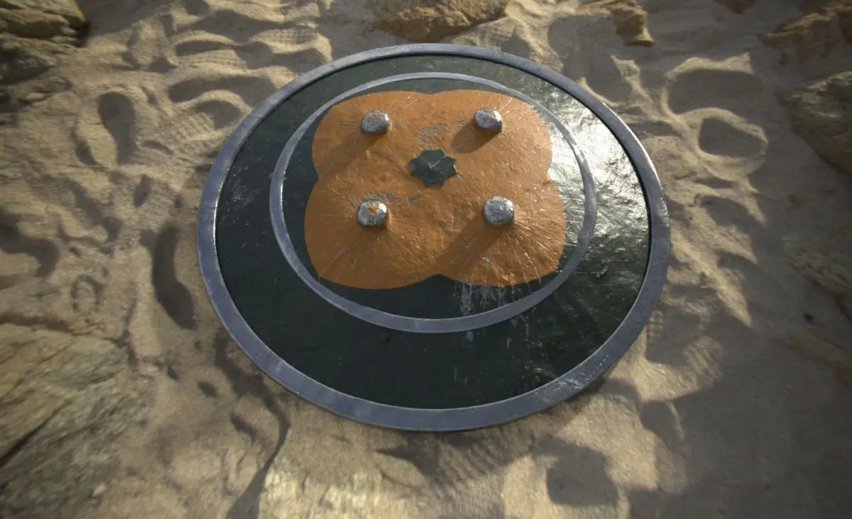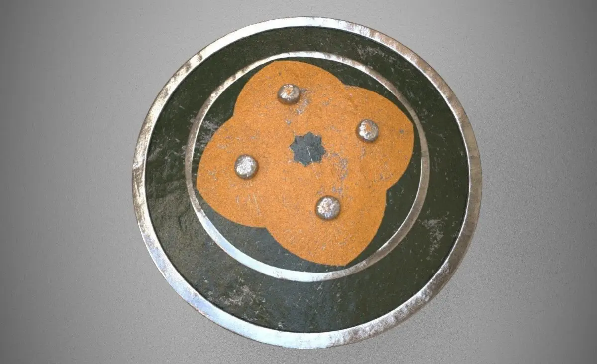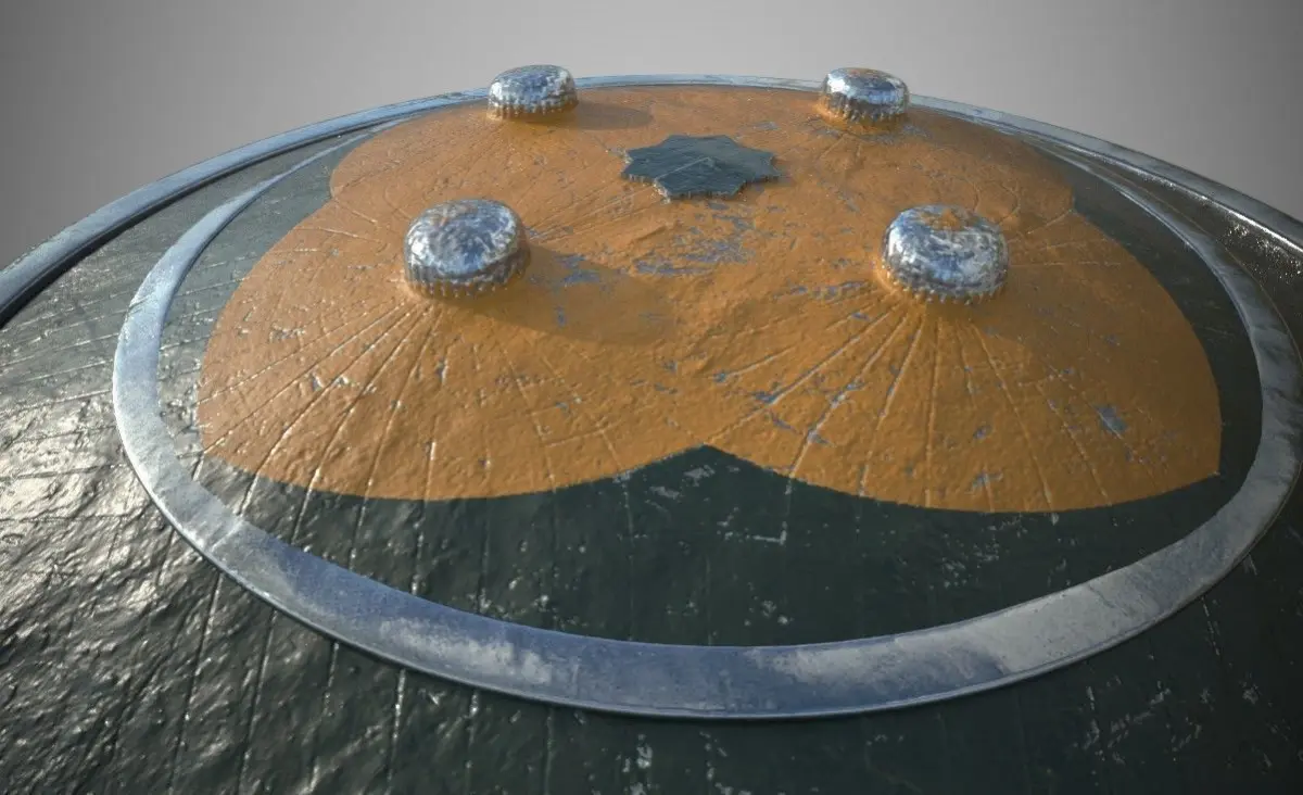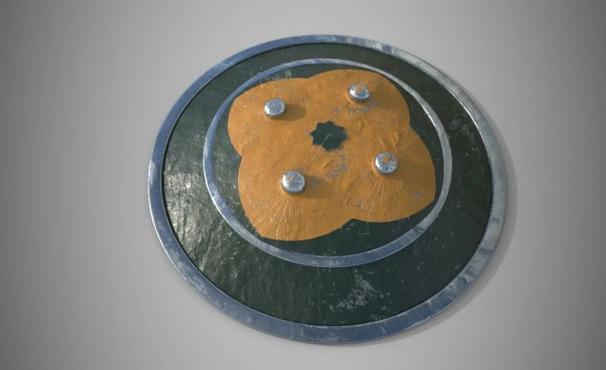 Mamluke Shield modeled after historical refrences.. made into different pieces all in one object(frontside, backside,metalparts,leatherstrips) modeled in blender and textured in SubstancePainter.. textured in 3 texture sets (main shield,leatherstrips,metalparts), with all five PBR textures included (base color,roughness,metallic,height,normals).. Frontside is textured as painted steel... while the backside is covered in leather