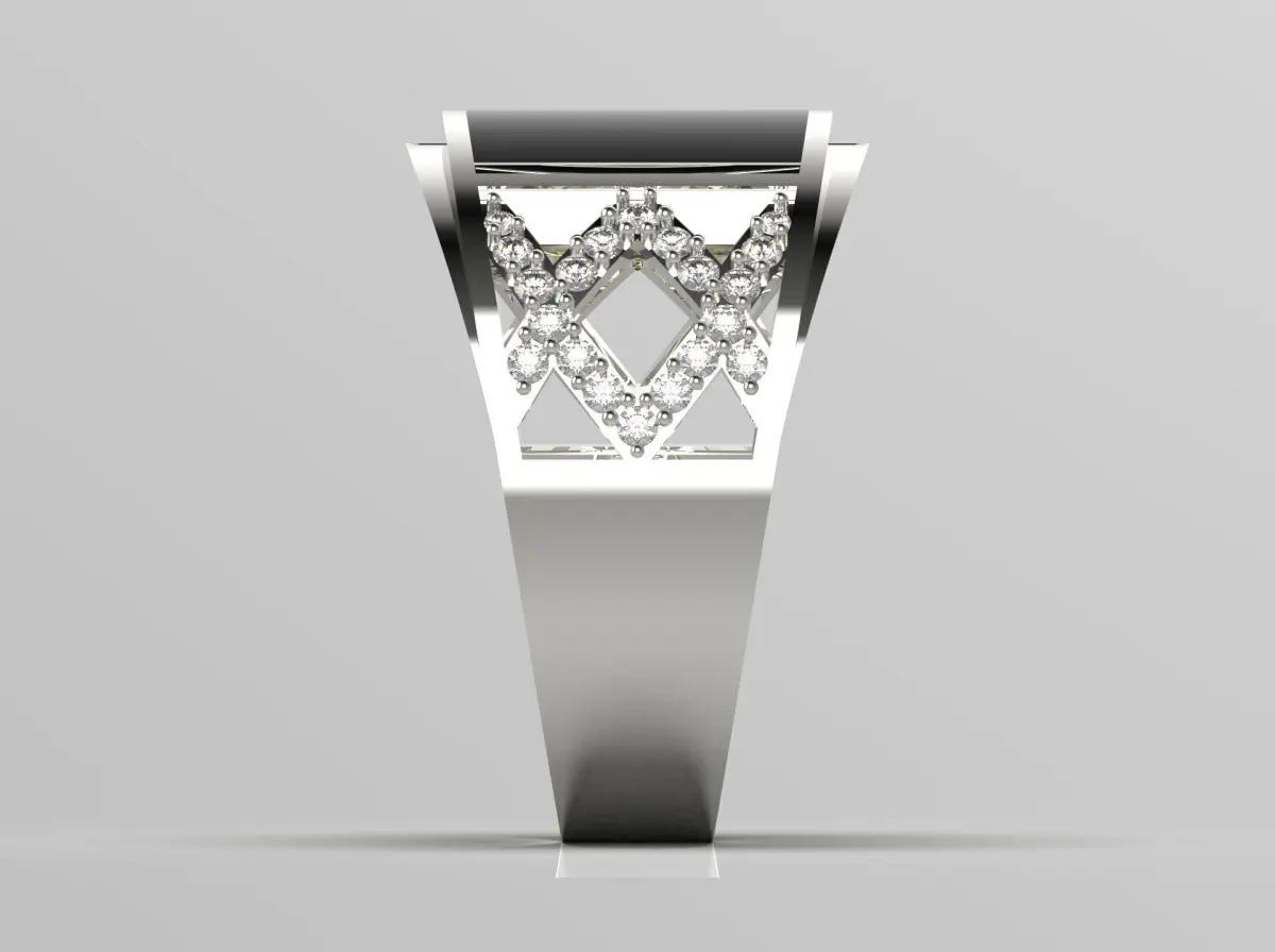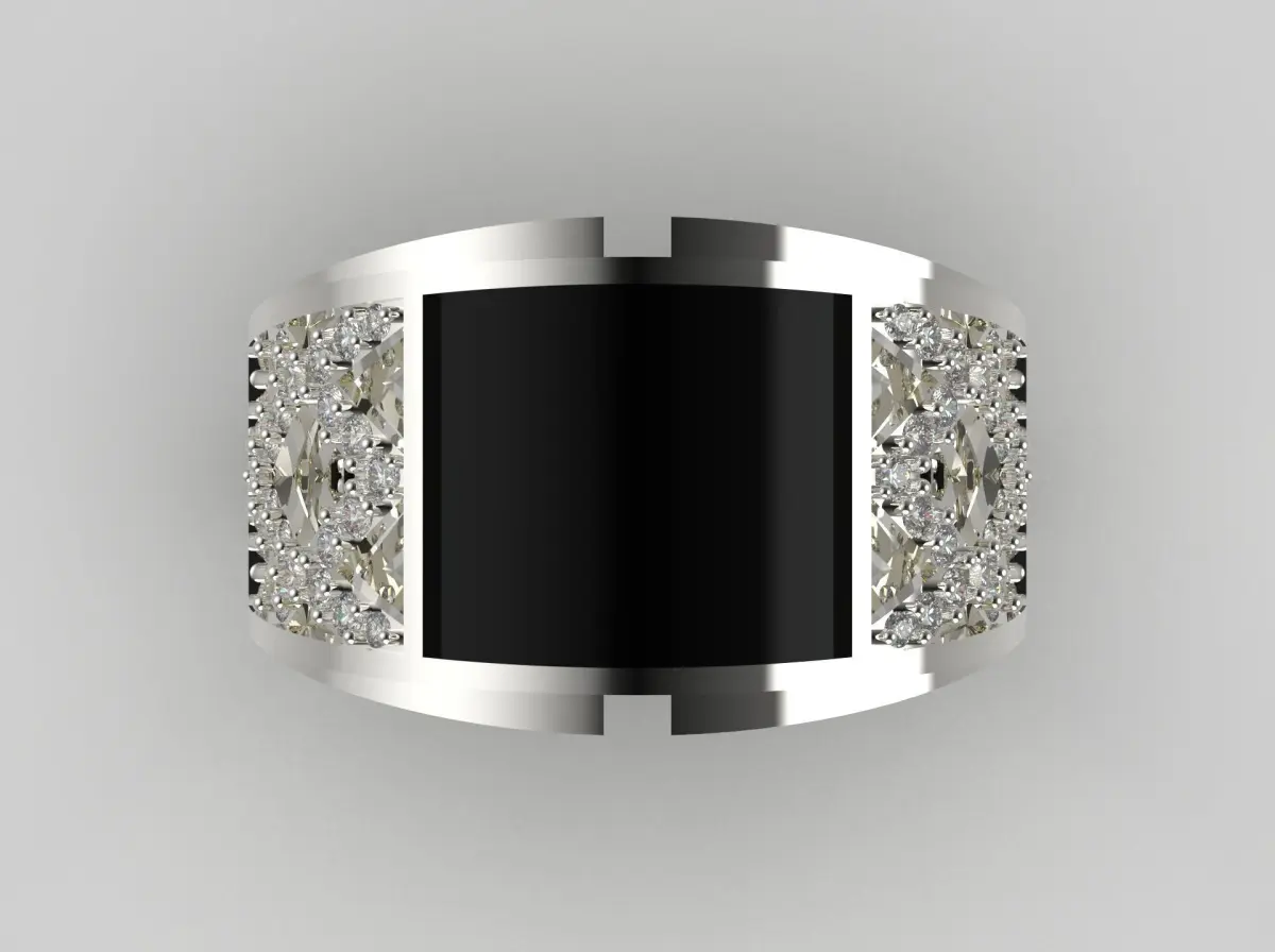The image is a close-up, digitally rendered shot of a ring. The ring has a modern design and is primarily silver or white gold in color. The top of the ring features a rectangular, black stone or inlay, which appears smooth and highly polished. The band of the ring is wide and embellished with clear gemstones, likely diamonds or cubic zirconia, that are set along the edges of the rectangular top and in decorative patterns on the sides. One side has a design incorporating a square shape outlined with these gems, and the inside of the band is cut out in a honeycomb pattern. The ring is displayed on a glossy gray surface, which reflects its form and adds to the sleek, contemporary aesthetic.