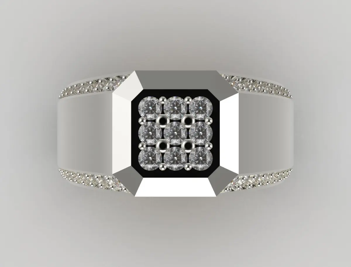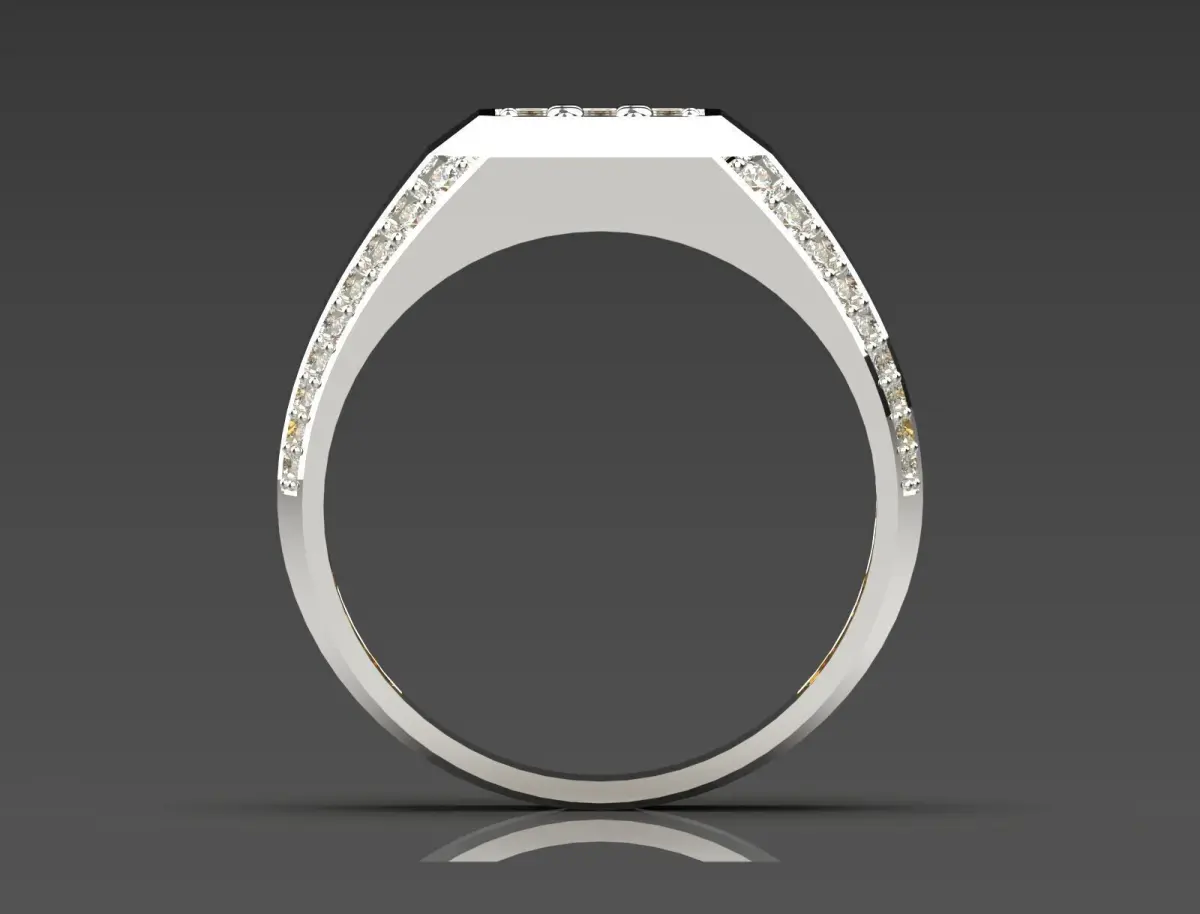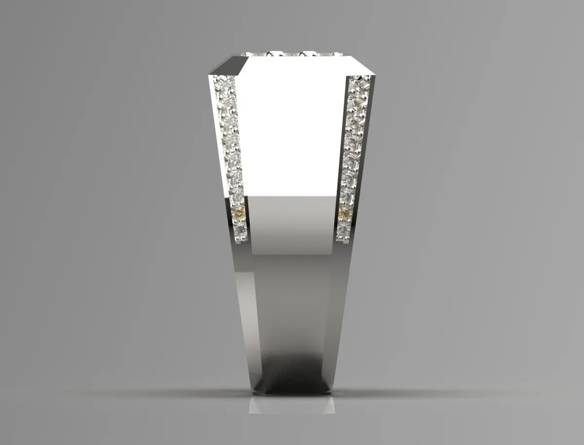Material: The ring has a polished silver surface that glistens under light.Design: It features a hexagonal top, embellished with multiple small stones, likely diamonds or cubic zirconia, creating a sparkling effect.Side Details: Along the sides, there are additional stones that enhance its luxurious appearance.Interior Design: The inner part of the ring displays a decorative pattern in gold, which adds an elegant contrast to the silver exterior.Overall, this ring combines contemporary design with a classic touch, making it a striking piece of jewelry.