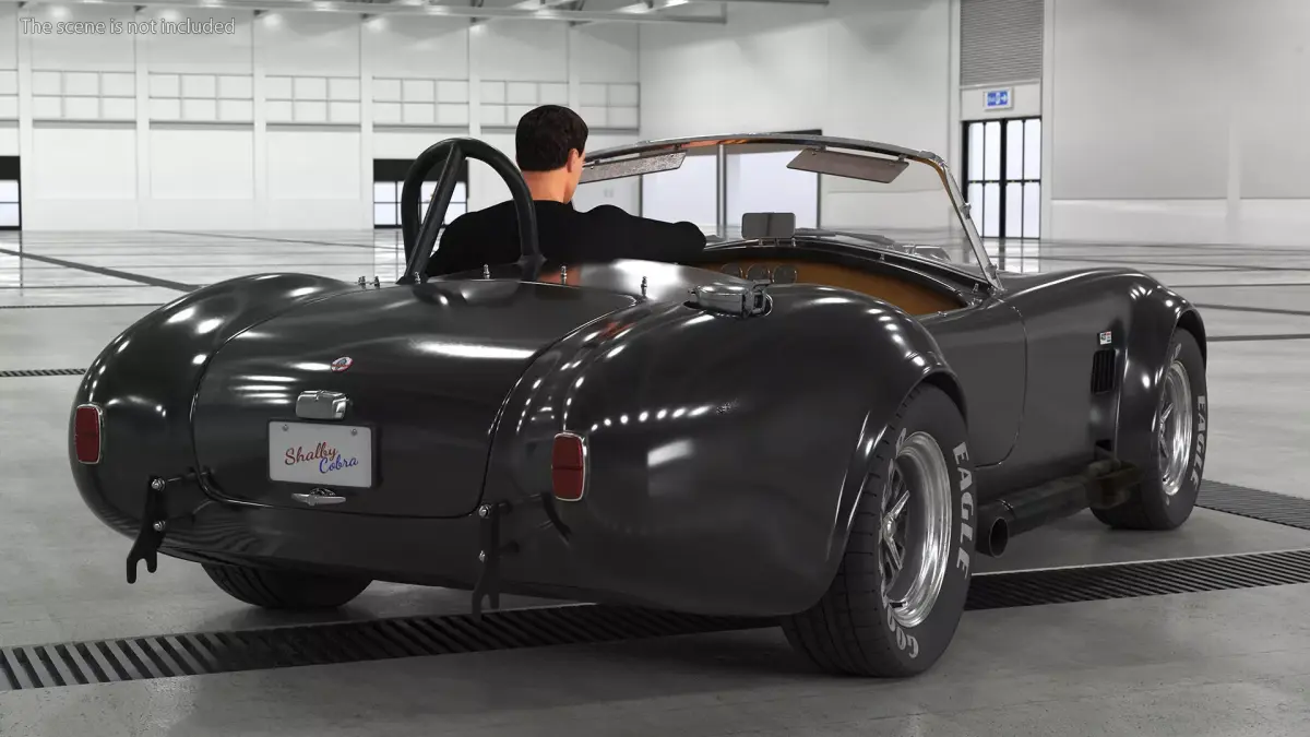 Man Driving Shelby Cobra 1965 is a 3d model of a driver behind the wheel of the classic Shelby Cobra 1965, capturing both the vehicle and its operator in a dynamic and realistic scene.