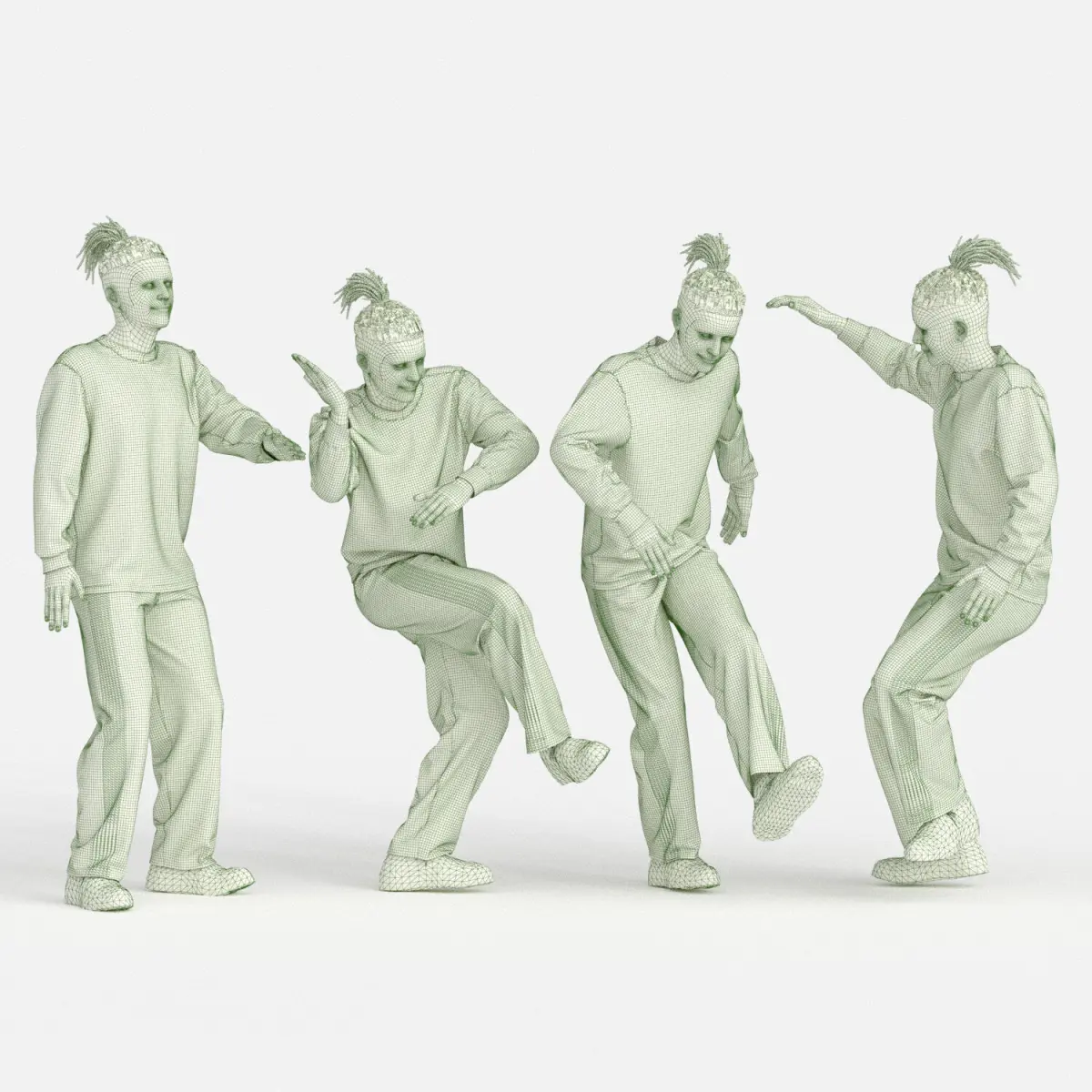 Name: Man in 04 Poses Street DanceType: modelMid: Format: 3Ds Max 2013Export: FBX, OBJ, MATRender: VRay (5.x), Corona (6)Polys: 349324Verts: 355748Matclasses: Multimaterial,VRayMtl,CoronaMtlUnits: CentimetersDimension: 277.5 x 112.86 x 186.85Modeller: SaharFaraji91Date: 2024.2.14Description:All textures are 4k Resolution.Hairs Textured with opacity map.Characters does not rigged.No third-party plugin or script required.UV Mapped: YesUnwrapped UVs: Non-overlappingHope you enjoy it!