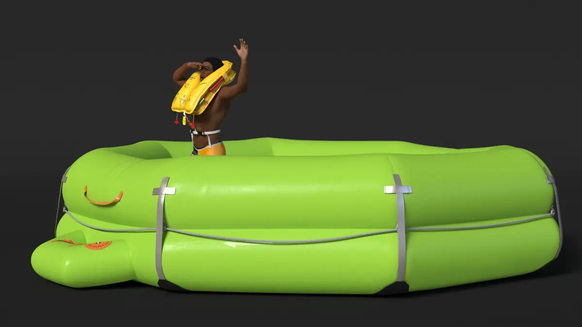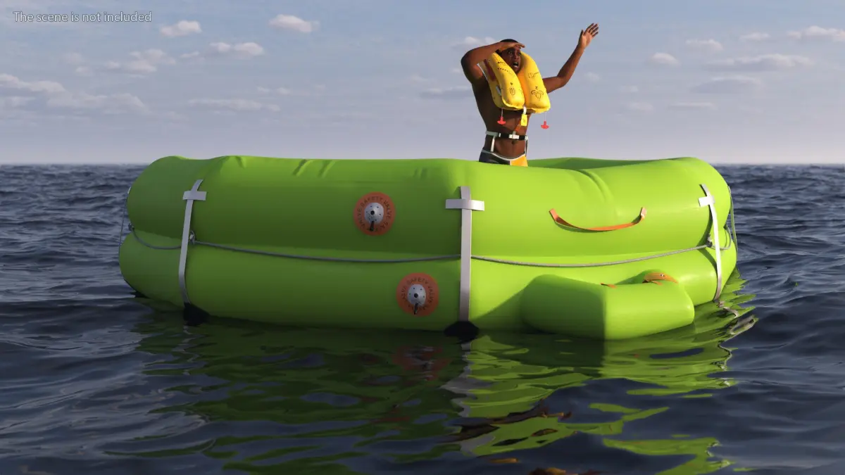 Man in Life Vest on Inflatable Raft is a three-dimensional model of Black or Afro American male (man) character in the inflatable life raft, that is a buoyant rescue device designed for emergency situations at sea, river, lake or ocean.