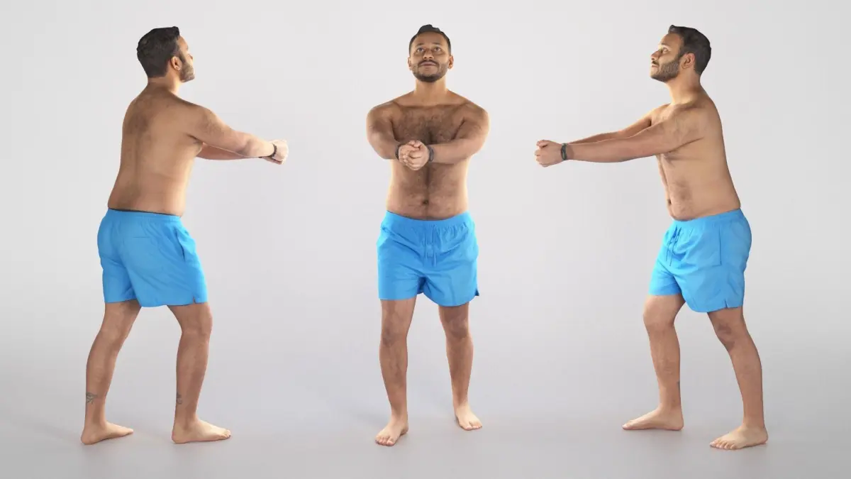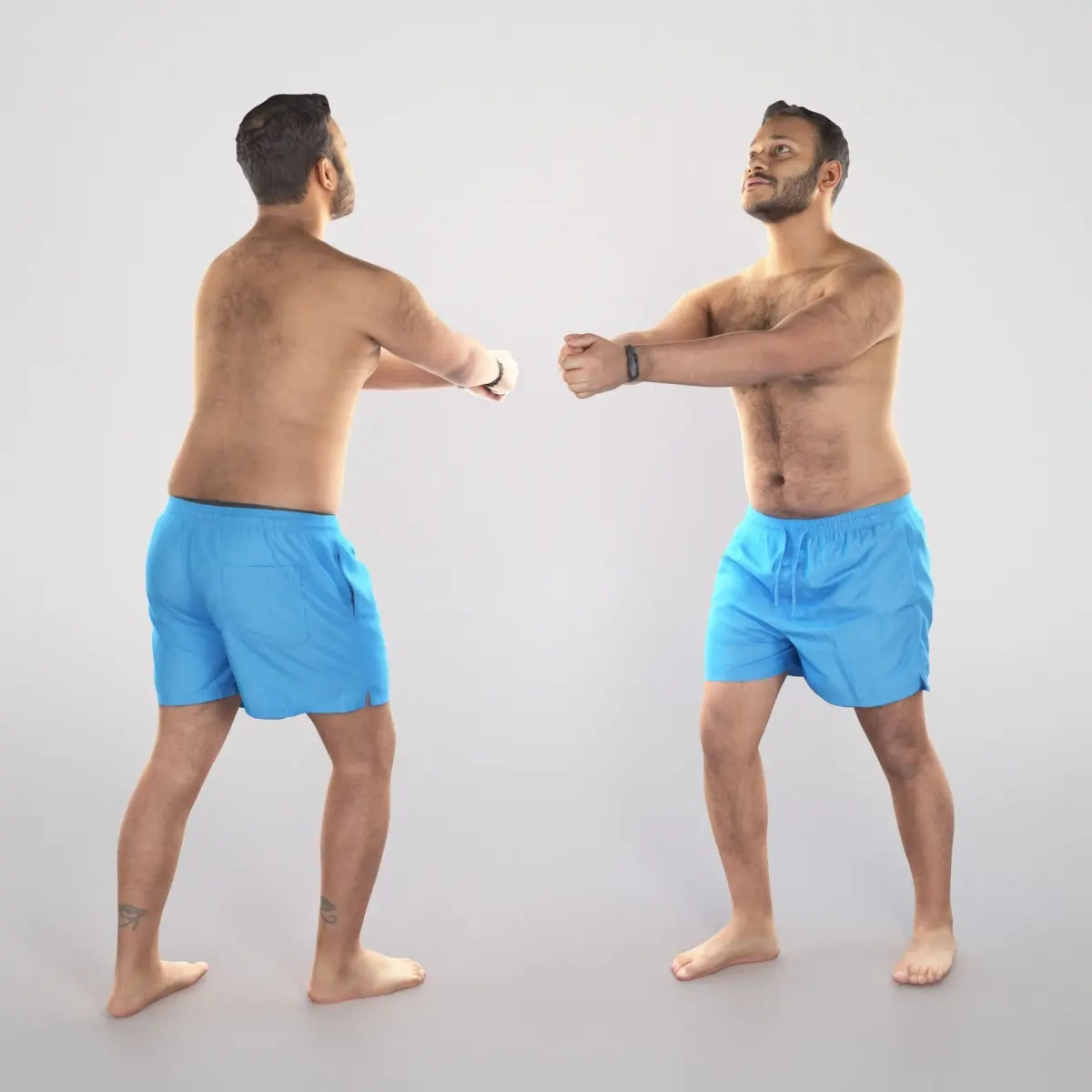 This is a true human size and detailed model of a sporty handsome young man of Caucasian appearance dressed in swimming trunks. The model is captured in casual pose to be perfectly matching for variety of architectural visualizations, e.g. beach, sport ground, gym, park, VR/AR content, etc.