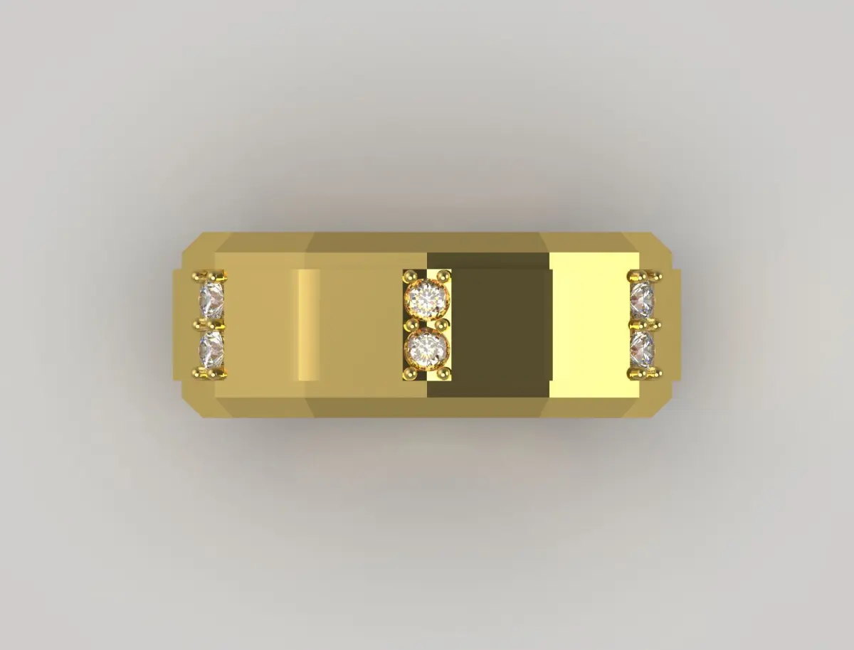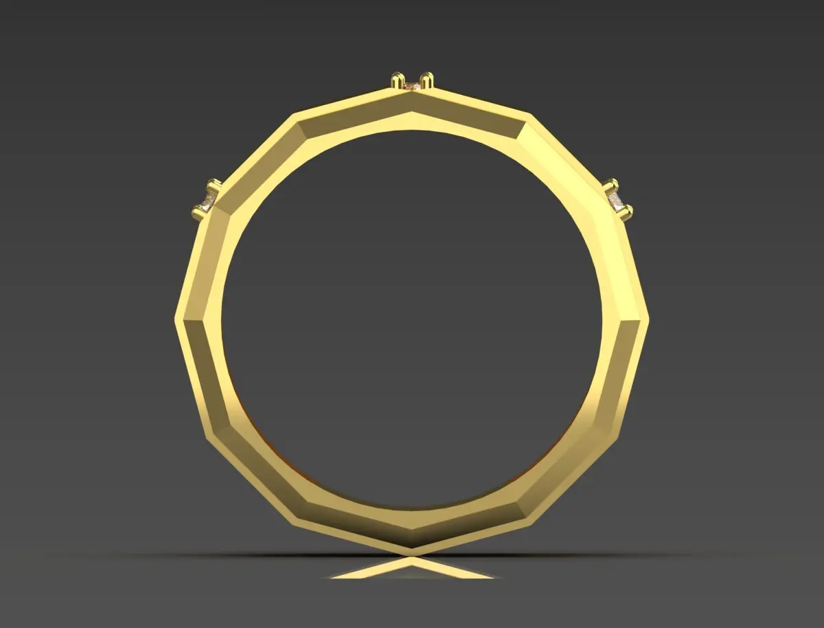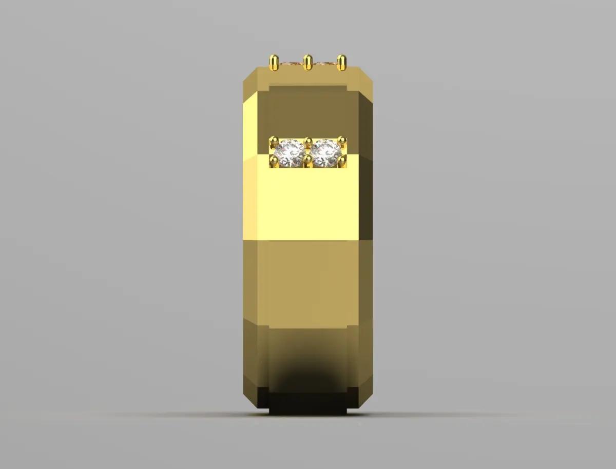 The ring features a modern and bold design, crafted from yellow gold. Its octagonal shape gives it a distinctive geometric appearance. Set into the band are three sparkling gemstones, likely diamonds, positioned symmetrically to enhance its elegance. The polished surface reflects light beautifully, adding to its luxurious feel. The overall design strikes a balance between contemporary and sophisticated, making it an ideal choice for both formal and casual occasions.