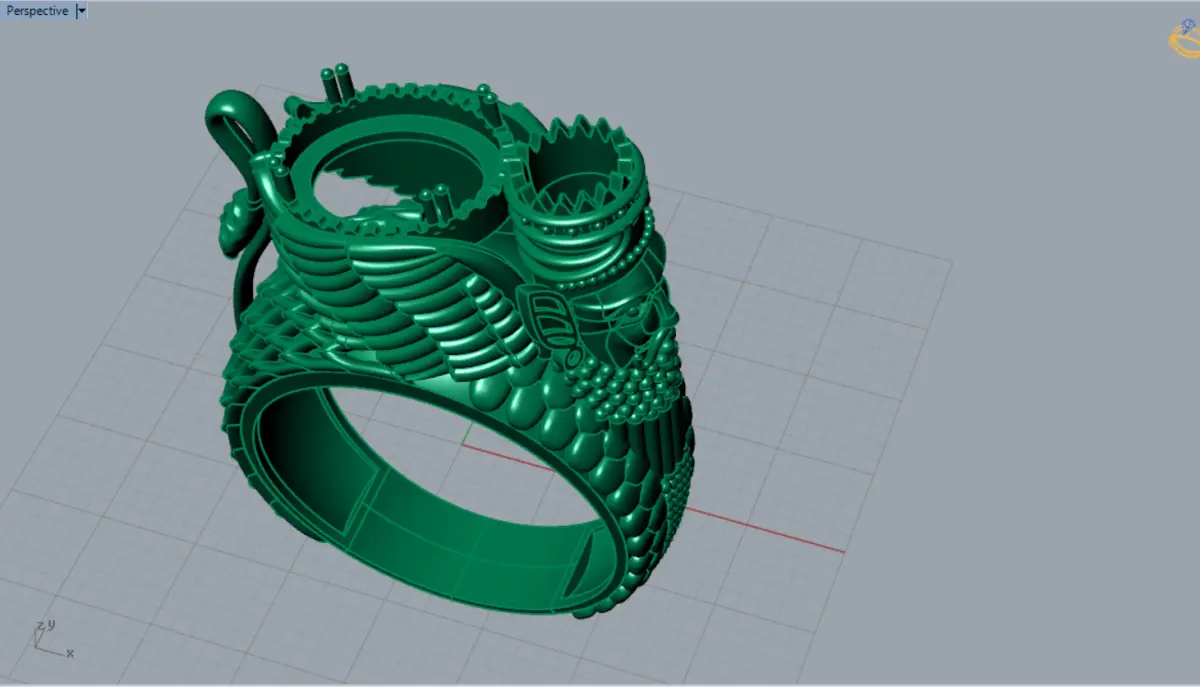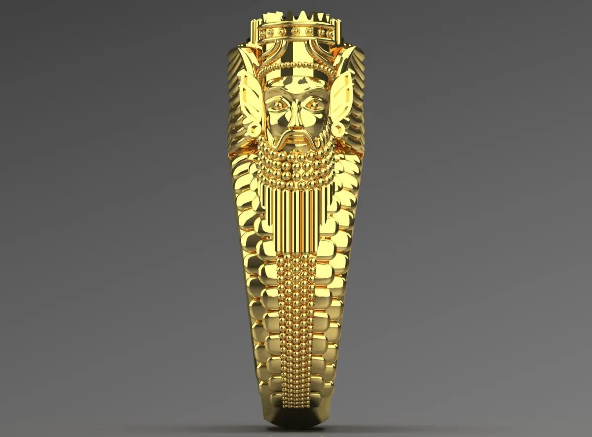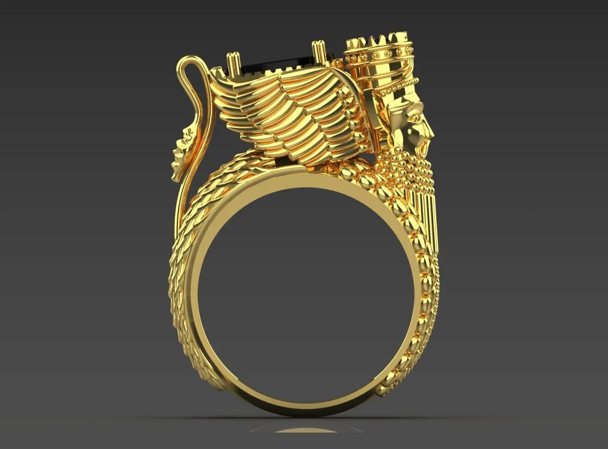 Winged Motifs (Farohar/Homa): On either side of the central gem, large, winged motifs are beautifully carved. These wings, reminiscent of ancient motifs and symbols such as Forohar (the symbol of Ahura Mazda and the human soul in Zoroastrianism) or the mythical bird Homa (the symbol of happiness and prosperity), give the ring a deep cultural depth and meaning. The details of the feathers of these wings are engraved with great care.Royal Figure/Crown: On one side of the ring, a relief of a head with a crowned hat (similar to ancient kings or helmets) can be seen, symbolizing power, royalty and leadership. The details of the face and crown are depicted with particular delicacy.Textured Stirrup Detail: The stirrup of the ring is also decorated with various textures; Including rows of small gold spheres (similar to the texture of pearls or rosary beads) and embossed vertical lines that give it an ancient yet sophisticated look.This ring is a unique combination of deep symbolism, high technical skill and visual beauty, designed for men with taste and charisma.