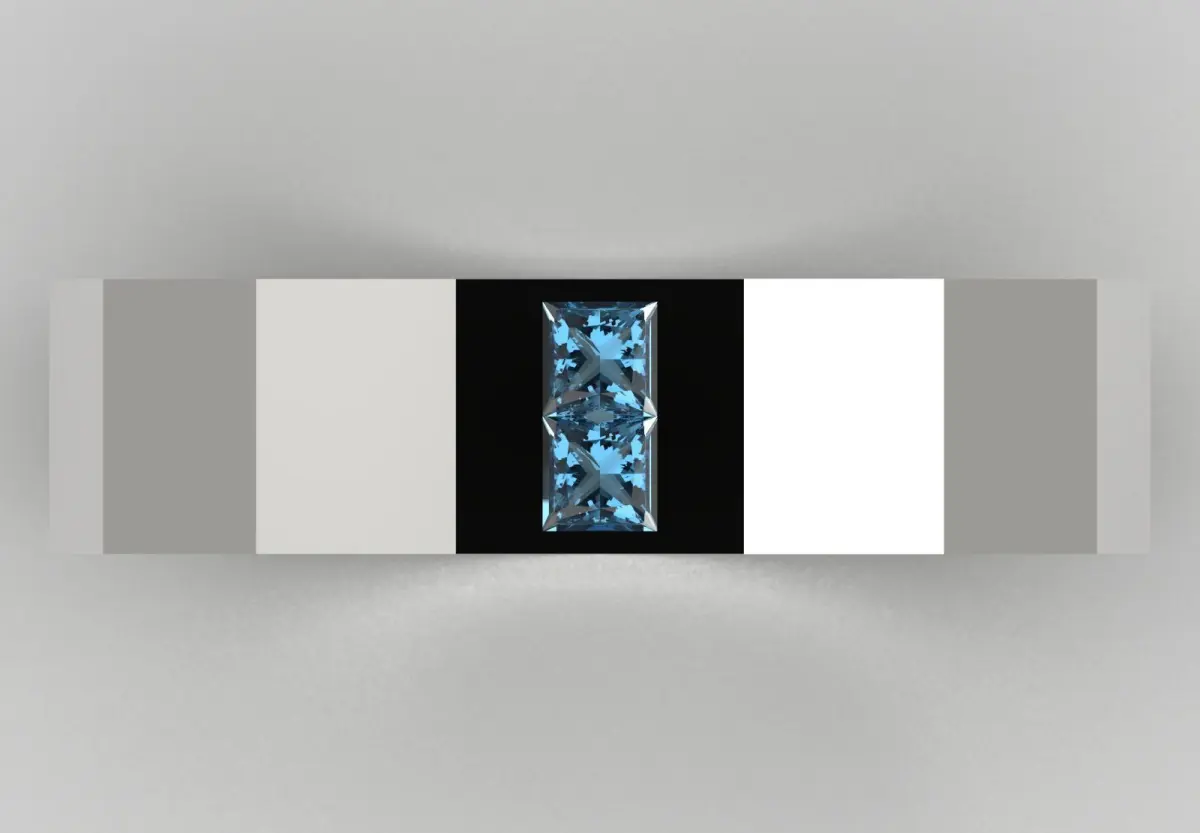 Gems: Two Baguette Cut or Emerald Cut gemstones in clear blue (possibly Blue Topaz, Aquamarine or Blue Dyed Diamond).