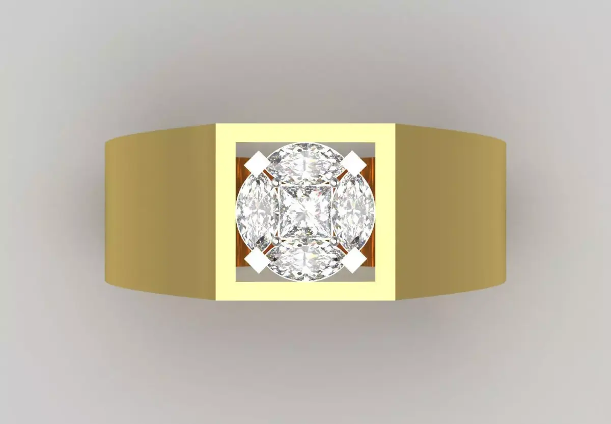 This men's ring with its modern and structured design is made of a wide and voluminous stirrup made of shiny yellow gold. The upper part of the ring is designed as a large and prominent square plate with a round and brilliant diamond gem (or similar gemstone) in the center. The diamond gem is in a square frame with sharp corners, which creates a beautiful contrast between the round shape of the gem and the geometric form of the frame.