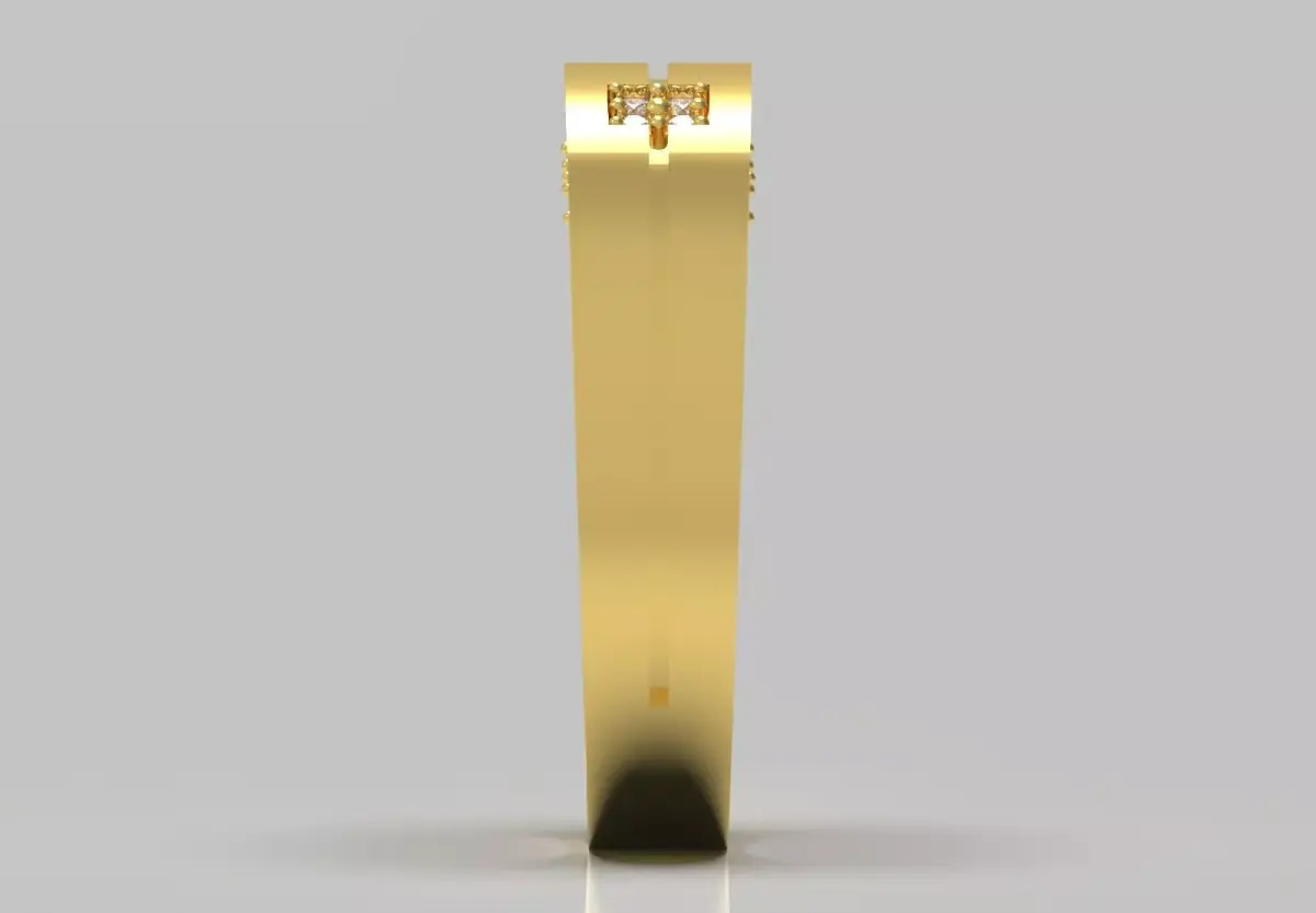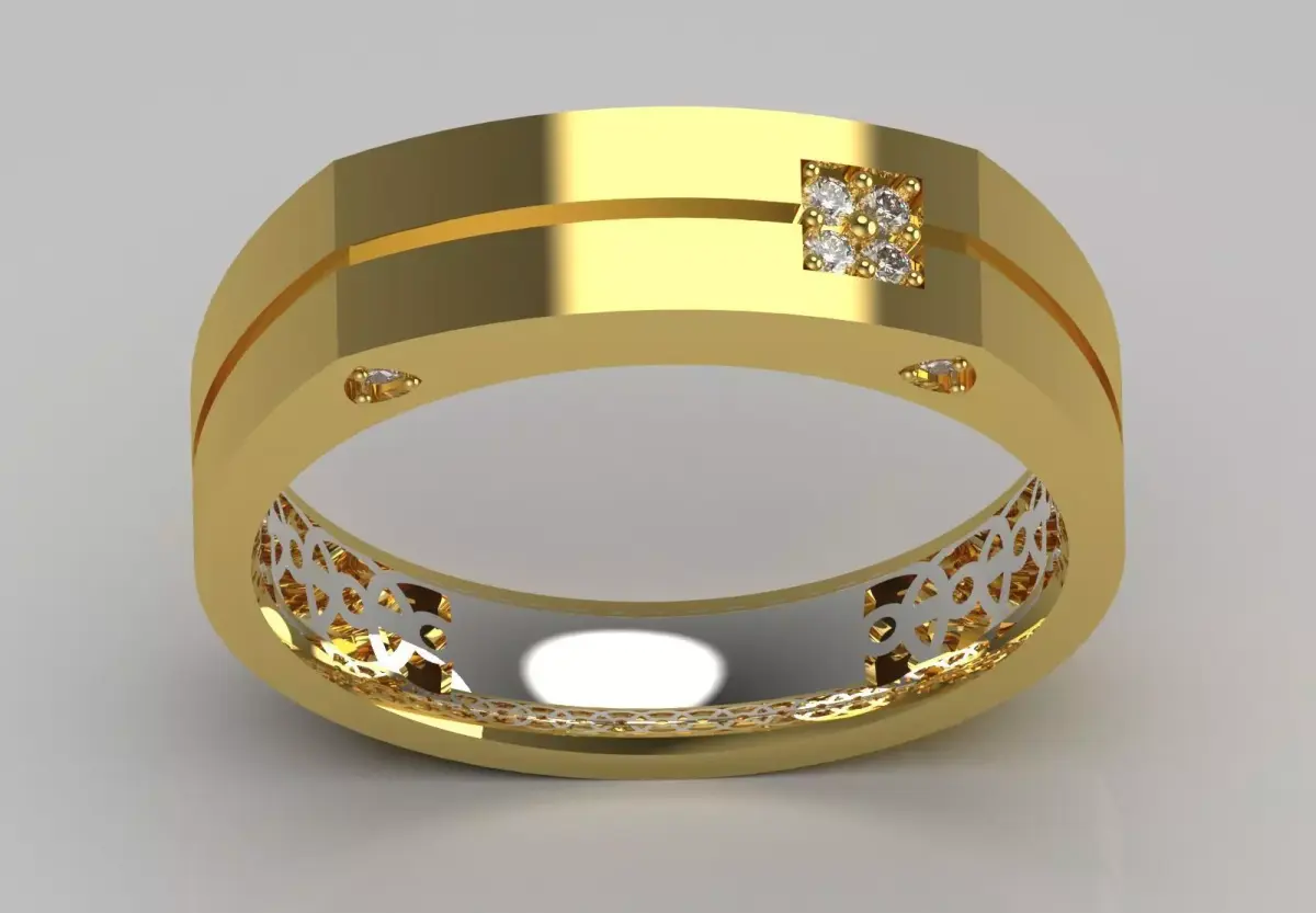 The technical design of this ring reveals different layers of beauty. The top part has a shiny central groove surrounded by a matte gold surface and leads to a diamond-cut square. Set in a bed of white gold, this square houses four round brilliant diamonds that give the ring an incomparable shine. But the highlight of the design is the precise and artistic lattice design that is located on the inner surface of the ring. This hidden detail not only adds to the beauty of the ring, but also helps in air circulation and greater comfort during use.