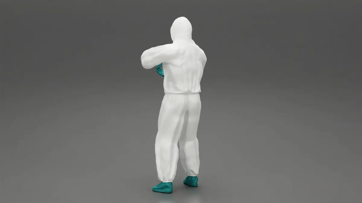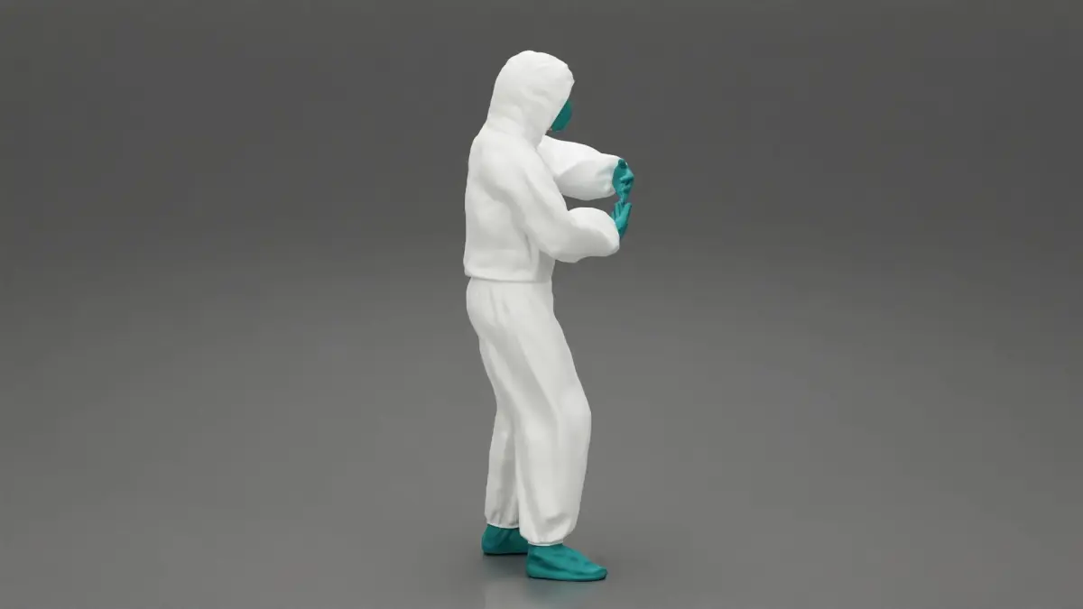 Home Catalog man wearing antivirus suit standing and carrying 3D print model