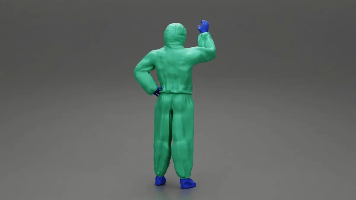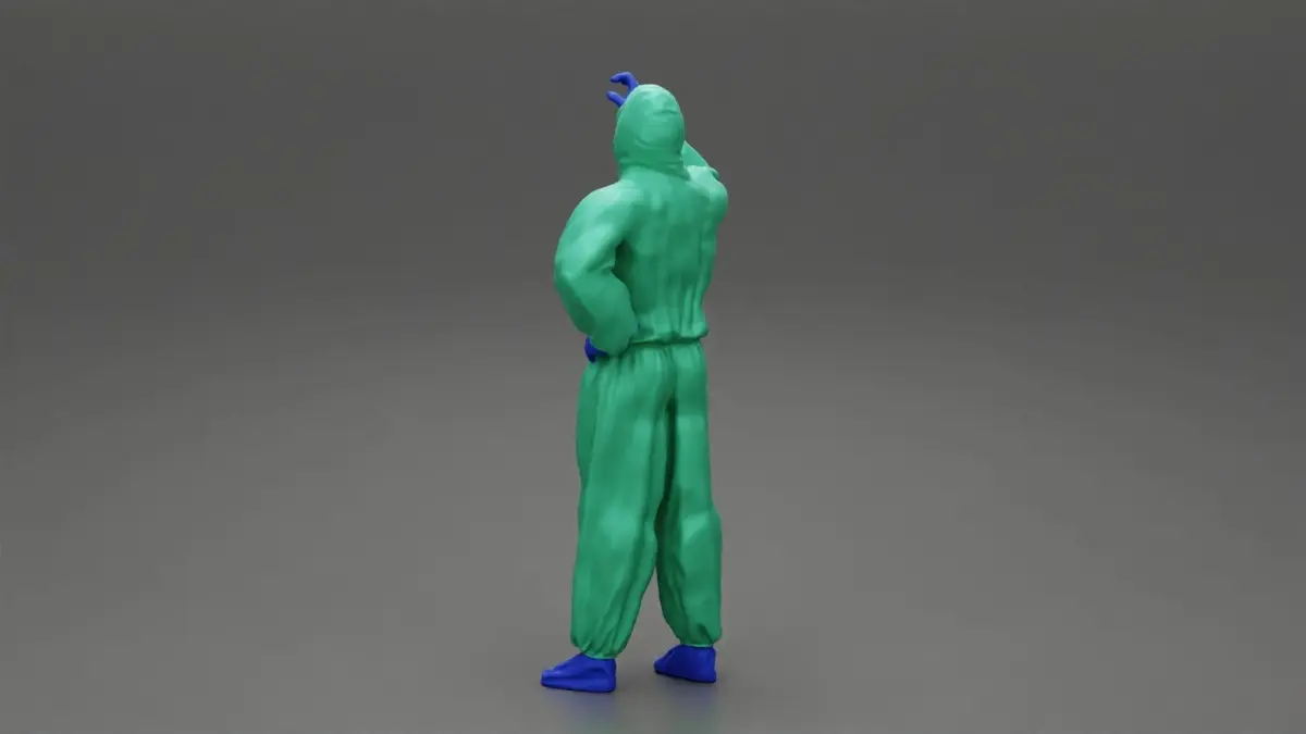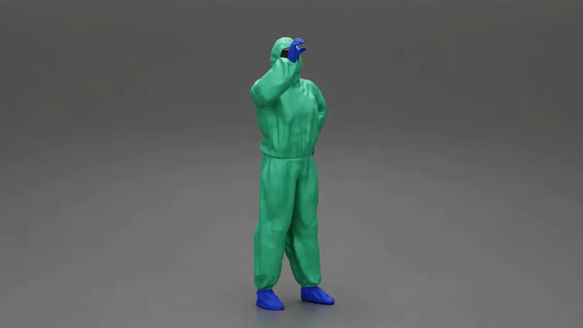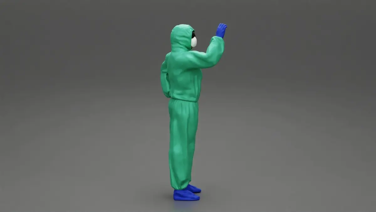 man wearing antivirus suit standing and holding 3D print model