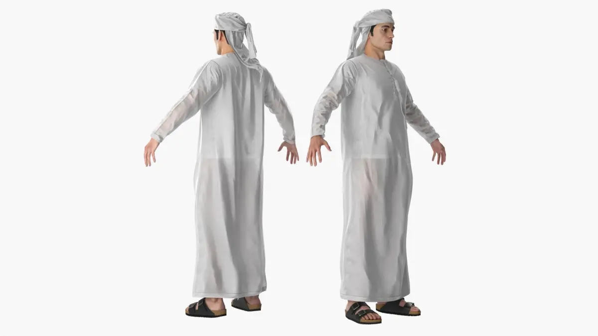 Man Wearing Omani Thobe with Keffiyeh White Fur for Cinema 4D is a 3d model of a man wearing traditional Middle Eastern clothing, often called a kandura or dishdasha, accompanied by a headscarf known as a ghutra.