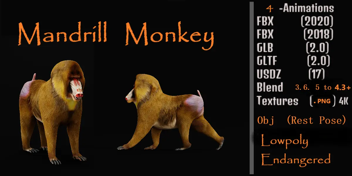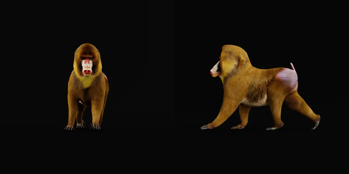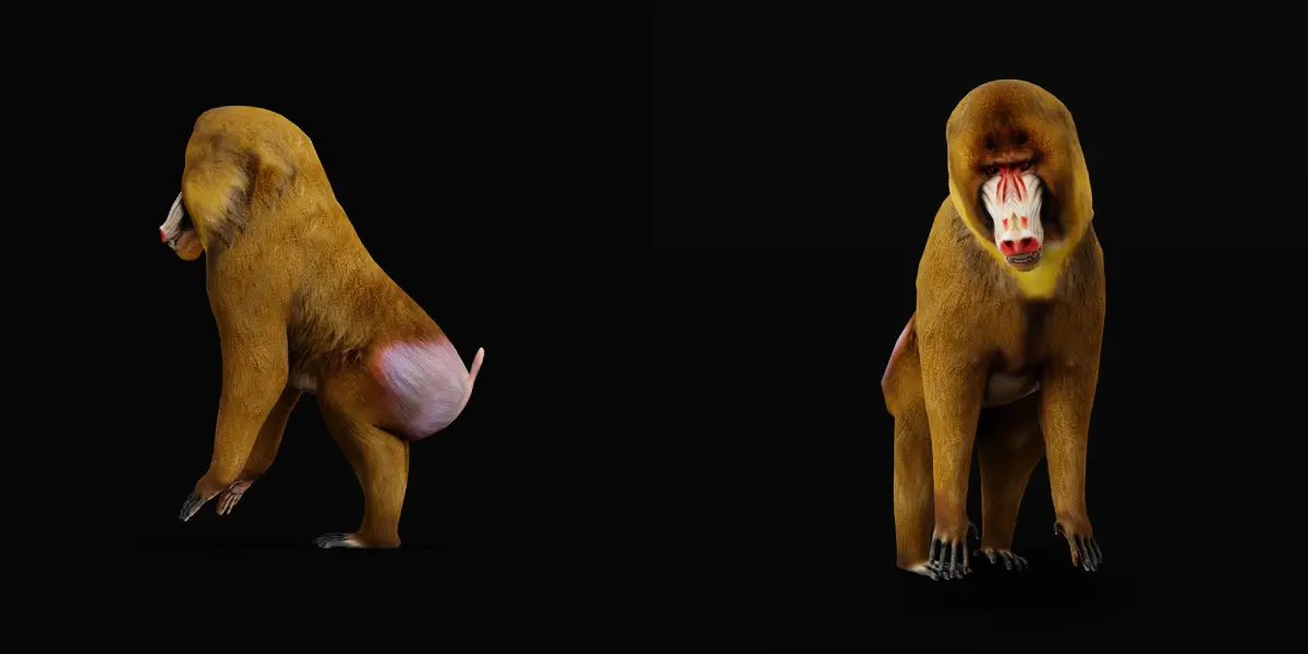 The mandrill is a large Old World monkey native to west central Africa. It is one of the most colorful mammals in the world, with red and blue skin on its face and posterior. The species is sexually dimorphic, as males have a larger body, longer canine teeth and brighter coloring..3D mandrill Animal Model By Nyilonelycompany.