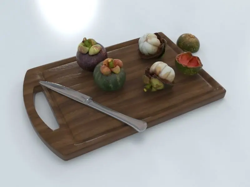 Made by Photogrammetry technic.The file content 3 Models of Mangosteen, High Poly and Low Poly.2 Models are a full Mangosteen and 1 Model is an Opened Mangosteen and his opened part.Include also a knife and the Wood Board.