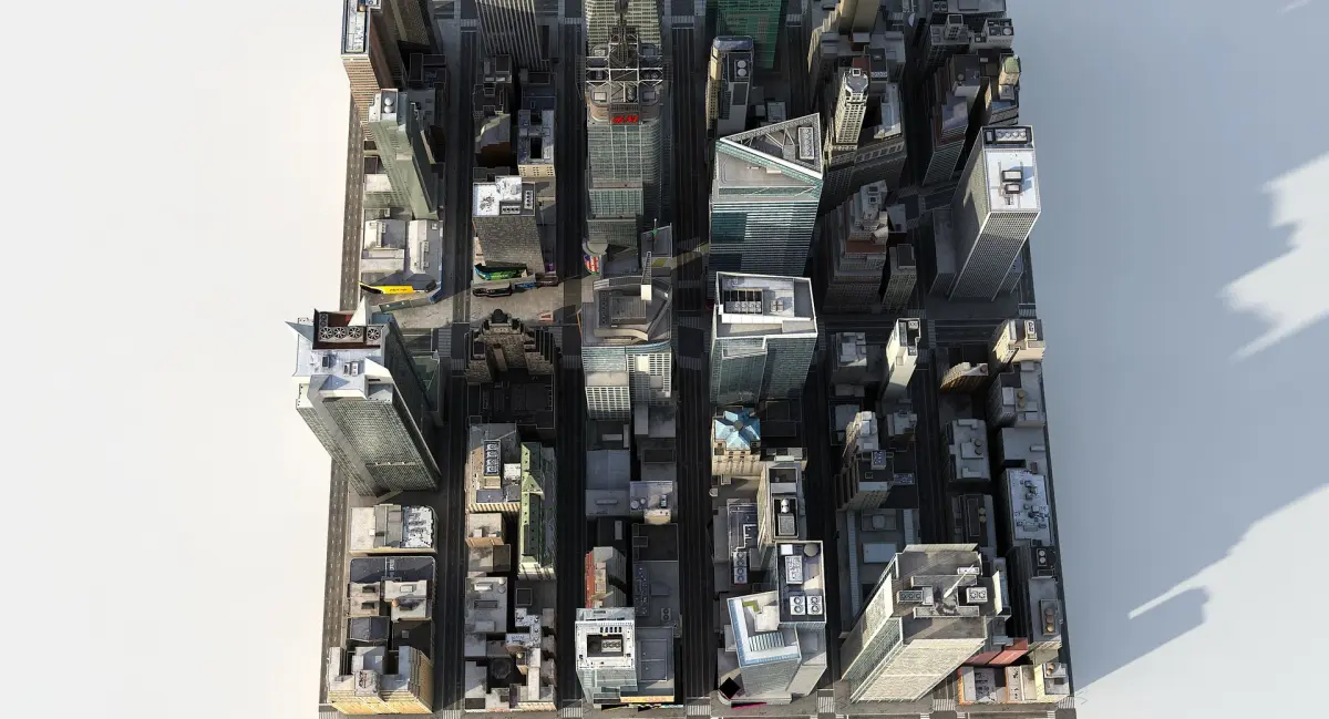All buildings are located and are scaled based satellite images.Each building, have height and shapes exact as original.