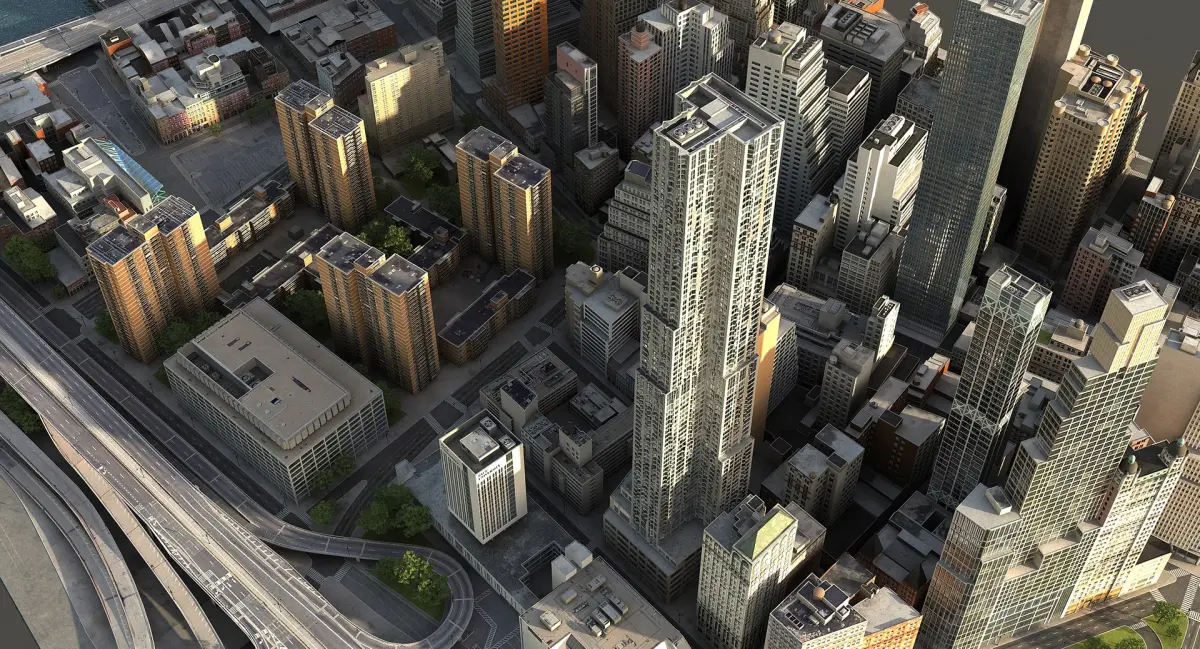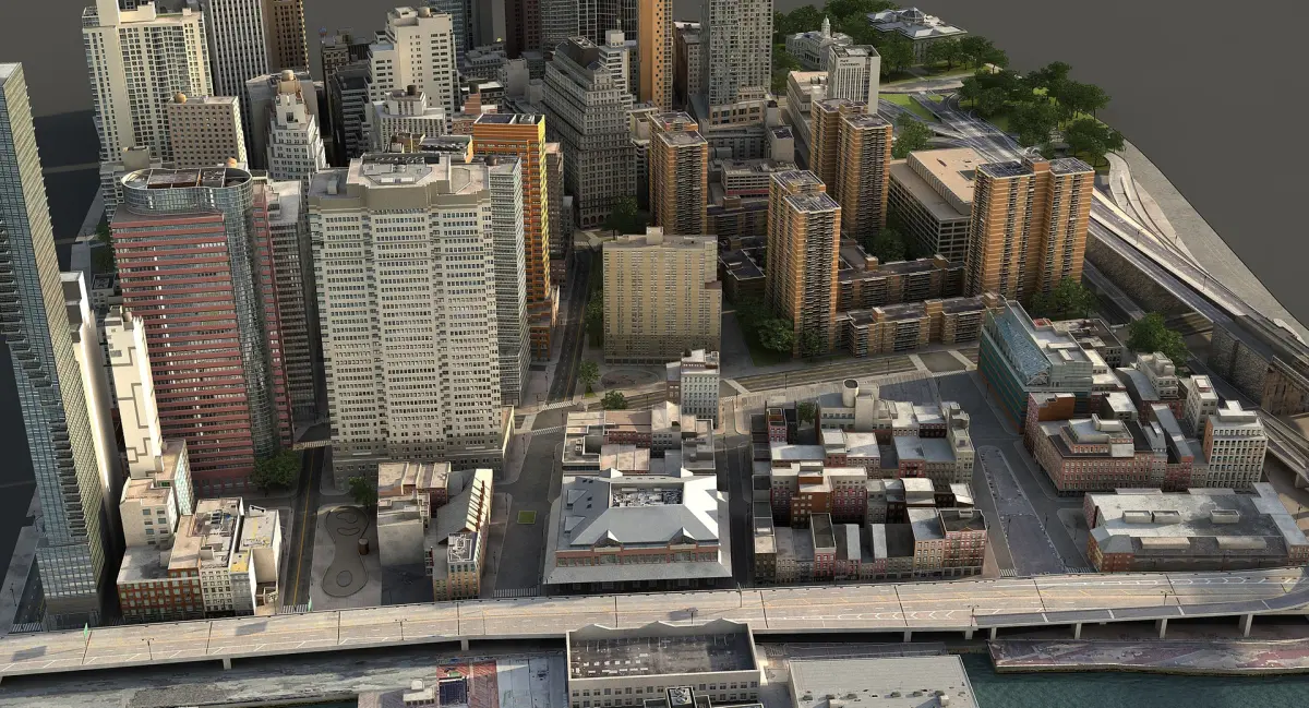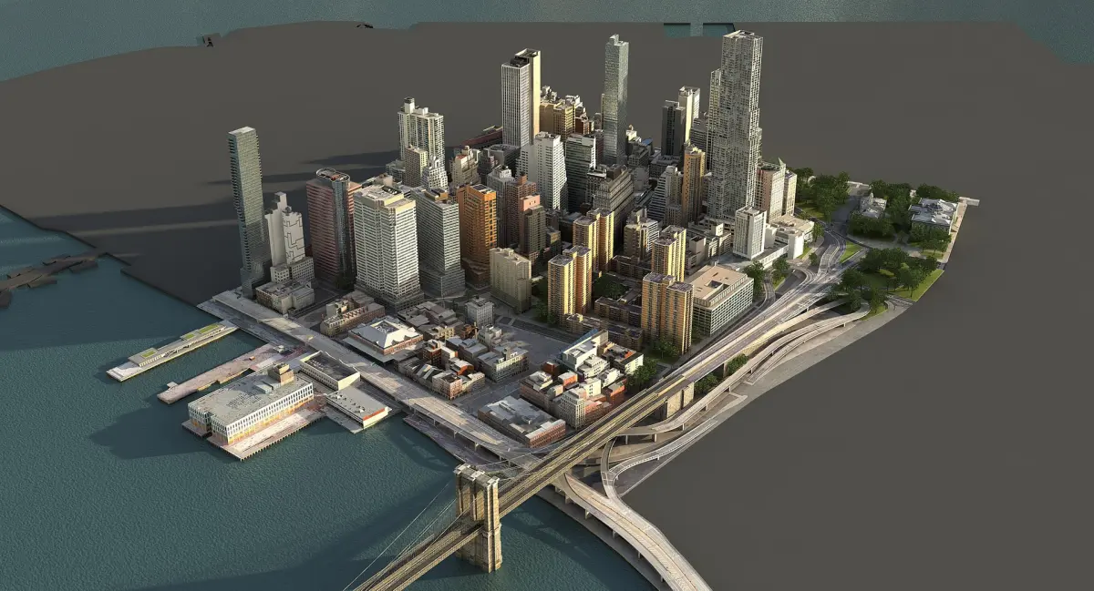This model represent part of the Manhattan lower tip area, (Brooklyn bridge side).