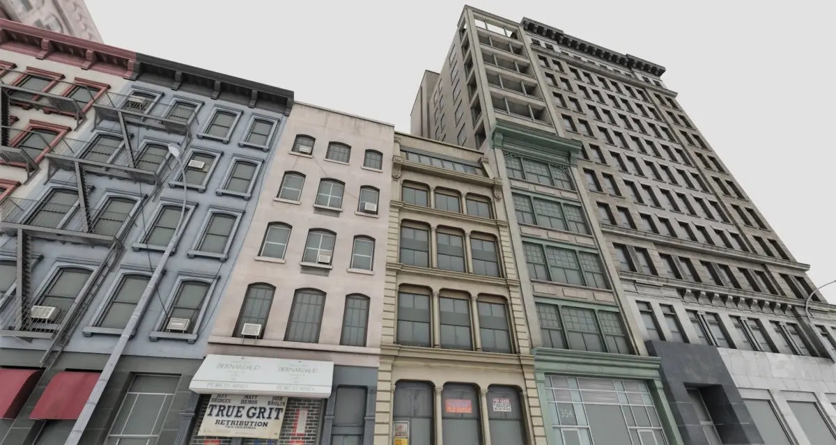 A detailed recreation of a city block in Manhattan: 358 Broadway Street.