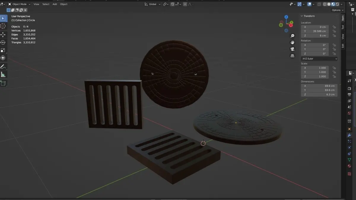 Manhole cover model. This model includes a manhole cover and a grating. The diameter of the manhole cover is 70 cm and the dimensions of the grating are 45 cm x 40 cm X 6 cm. The main file format is .blend. Required file formats and images as examples have been uploaded. You can use the manhole cover model in your desired project, game or movie scenes. Thank you for the interest you have shown. Please do not forget to like and comment.