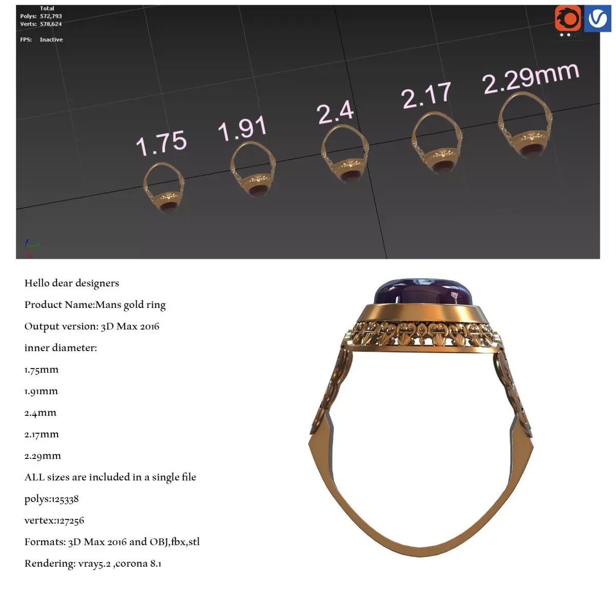 Hello dear designersProduct Name:Mans gold ringOutput version: 3D Max 2016inner diameter:1.75mm1.91mm2.4mm2.17mm2.29mmALL sizes are included in a single filepolys:125338vertex:127256Formats: 3D Max 2016 and OBJ,fbx,stlRendering: vray5.2 ,corona 8.1