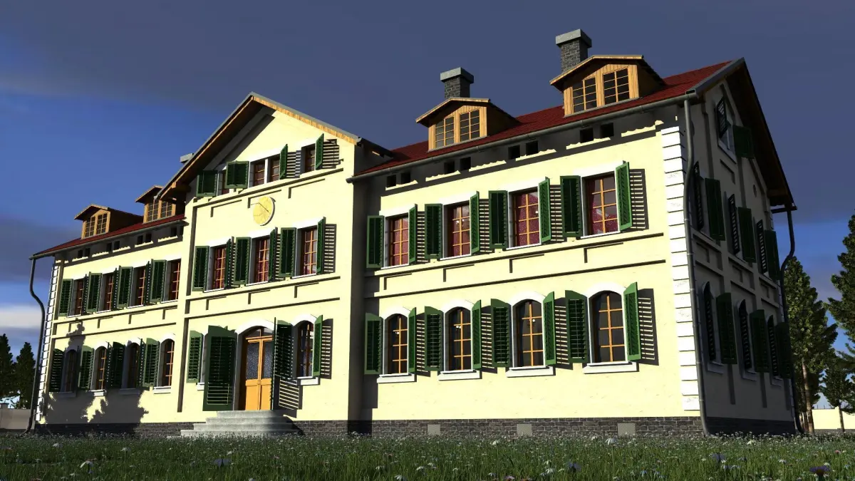 Neo-renaissance-style building from the second half of 19th or early 20th century, Europe. Such building were used as mansions, office buildings, railway stations, apartment blocks, city halls, schools, hotels or various other purposes. With some modifications it can be used even as a small factory. Originally designed in Lightwave 3D, never used in any projects. The model is realscale, the three level building is 26m long, 10 m wide and 10.5m high and has a cellar below the surface. It has 26 rooms and a large two level hall. All windows, doors, shutters are moveable. Internal structure is provided with the model; stairways, victorian style tapestry, chandeliers and wall lights,carpets, curtains, barrels and sacks in cellar, etc. are there, you just have to place your own furniture. The building looks as new, but it can be easily transformed to an abandoned house. I placed it to a small courtyard and added a fence, but it will fit good into a XIXth-XXth Century city scene. (There were a lot of such buildings in Europe during 2nd WW) Lighting can be switched to gas lights or candles very easily.