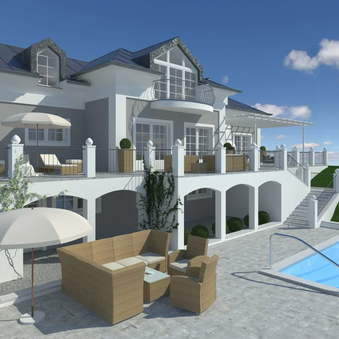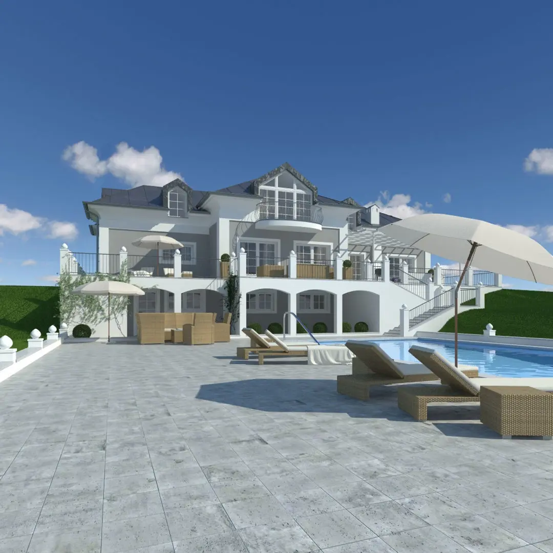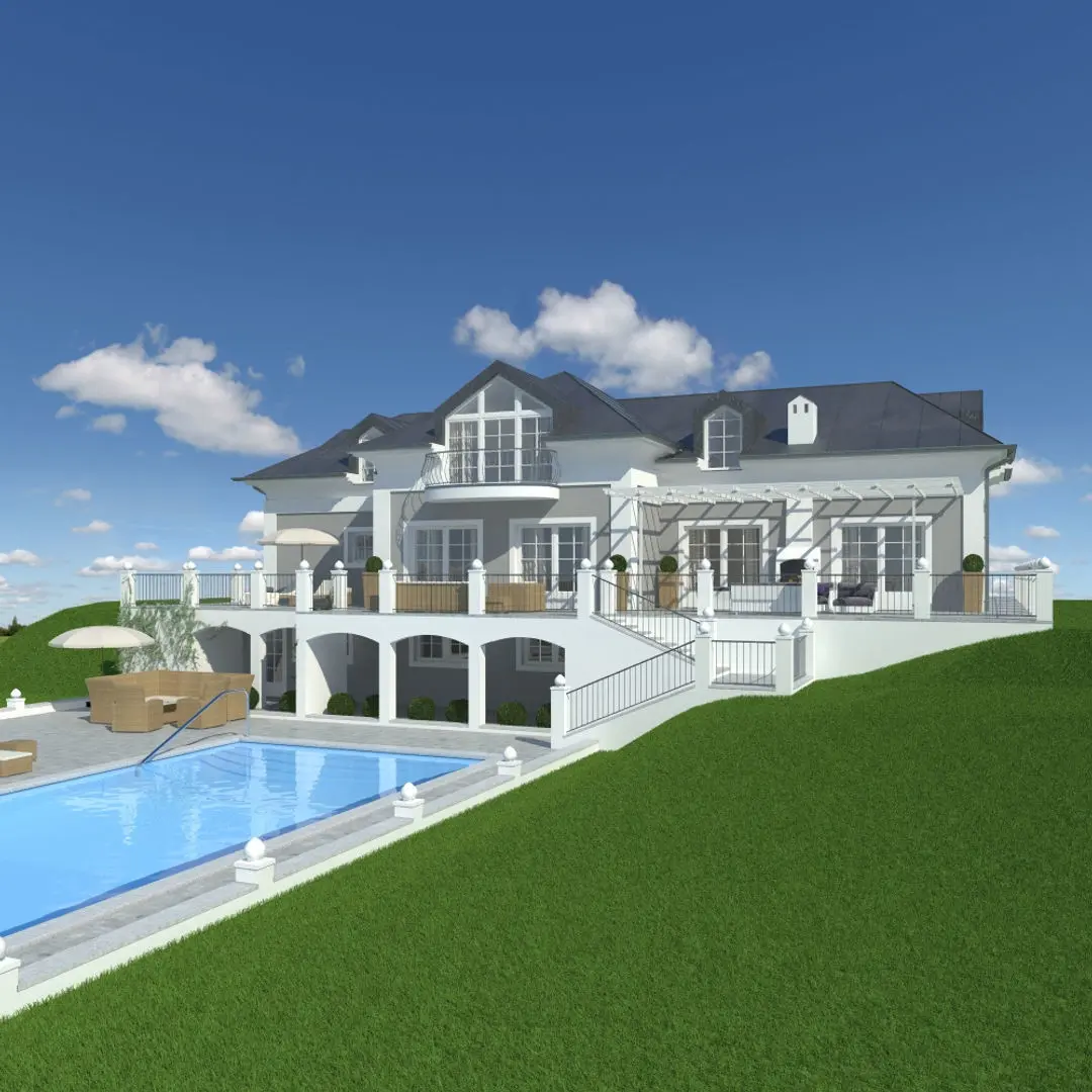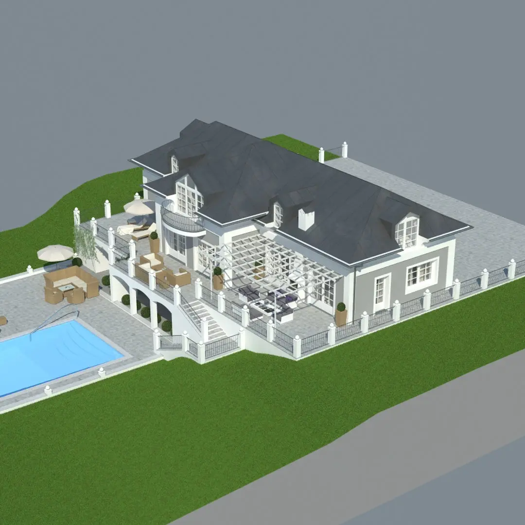 HIRES MODEL OF A MANSION WITH POOL AND GARDEN