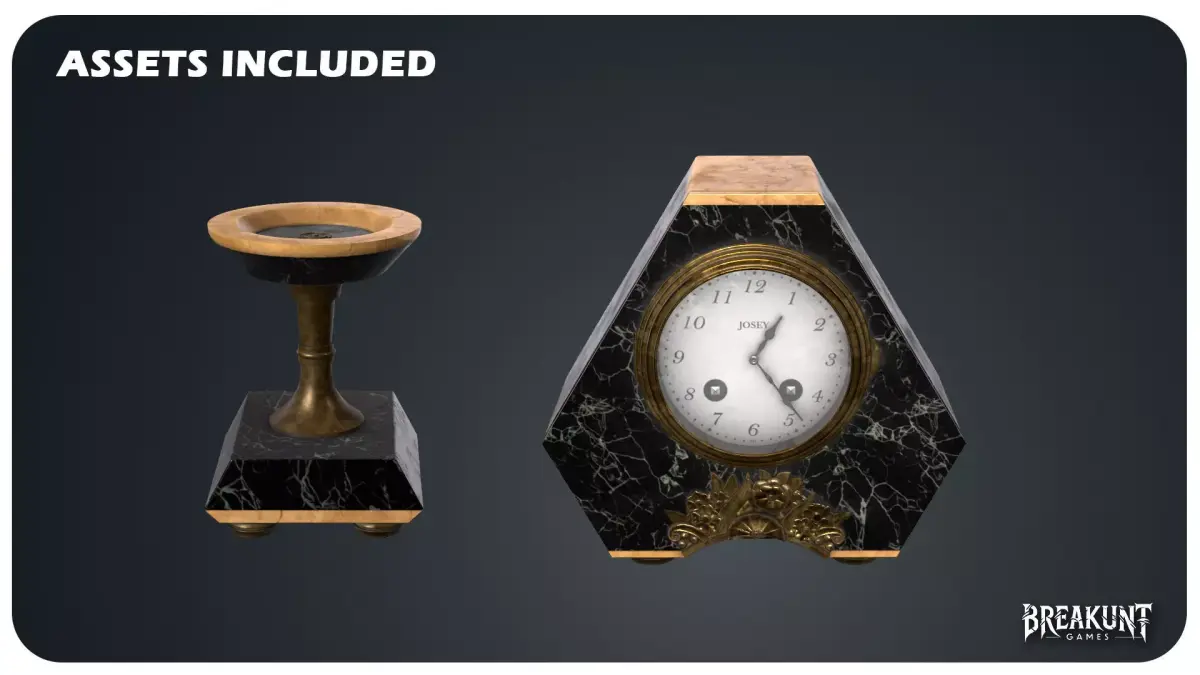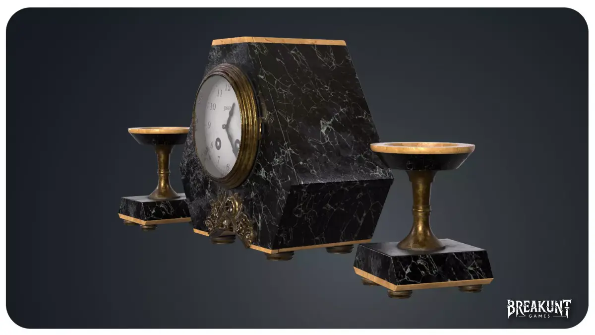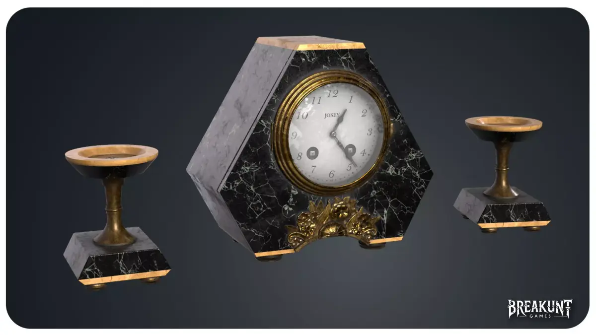 Designed to bring refined early-20th-century character to interior scenes, this realistic marblemantel clock set includes one central mantel clock and two matching decorative coupelles / candle holders. The main piece combines a dark marble body, aged brass details,a readable vintage dial, and a sculpted floral ornament that strengthens the premium antique look. Thetwo side elements help create a complete symmetrical composition for shelves, fireplaces, bourgeoisinteriors, hotel spaces, historical rooms, or cinematic close-ups.Created for games, cinematics, archviz and real-time rendering, the set offers strongsilhouette quality, convincing material definition, and detailed surface work suitable for close cameraangles. It fits naturally into Victorian, 1900s, classical, haunted mansion, luxuryantique, and realistic interior environments. A strong choice for artists who need a decorative hero propwith immediate visual value and easy scene integration.