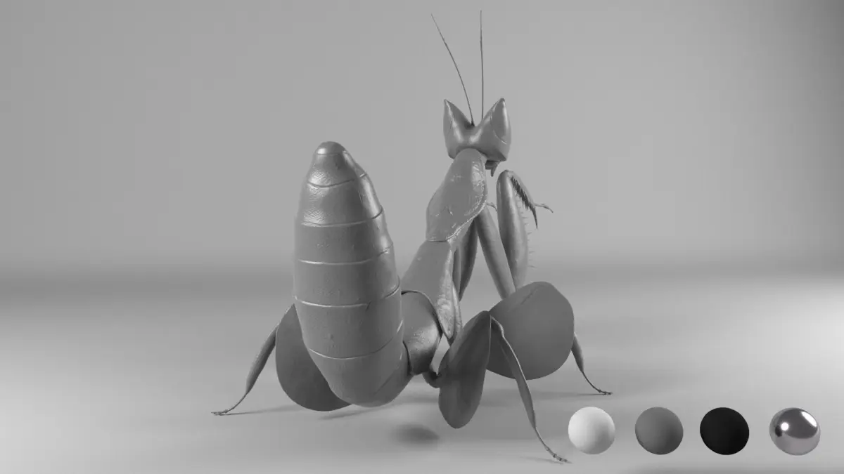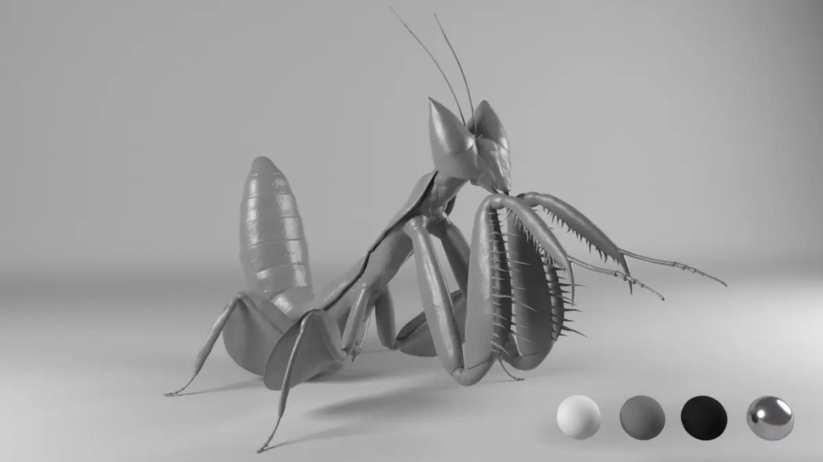 Orchid, Mantis polygon mesh made with Maya and Mudbox. UVs are all unwrapped and There is a Displacement Map, but NO textures are included. The shaded Mantis Preview is an example of what you can do with this mantis.