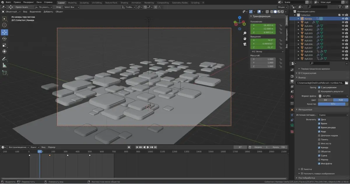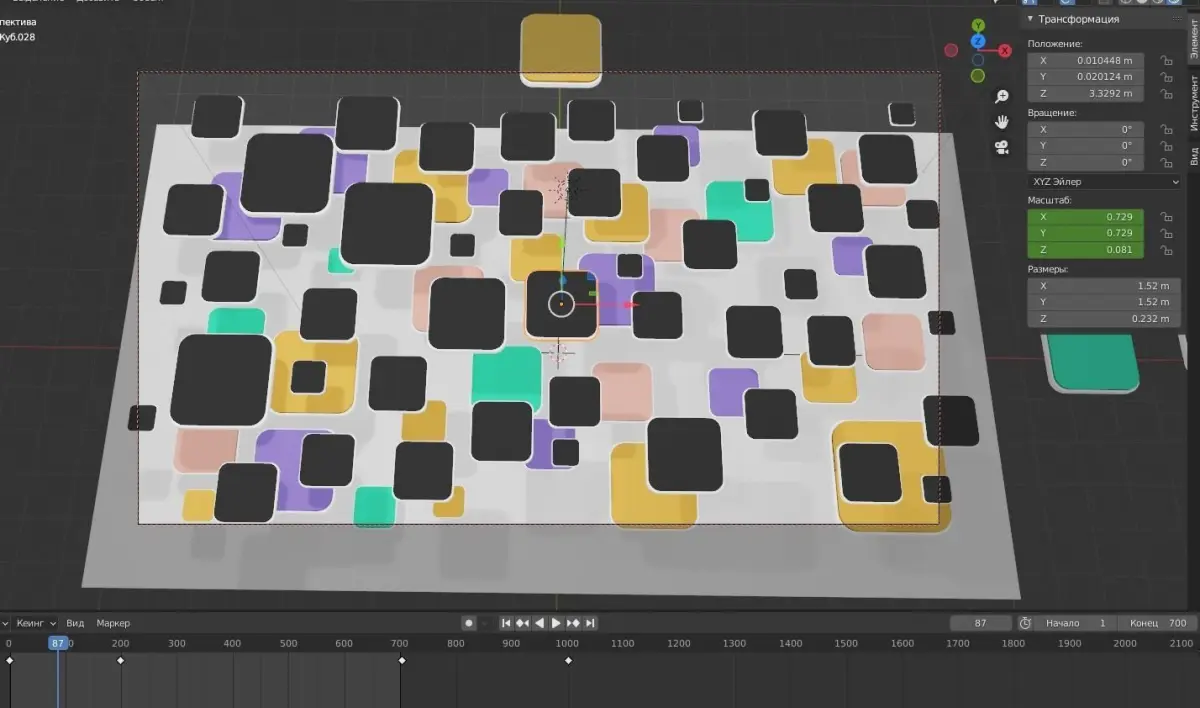 Cubes. Many cubes that are hovering in the air and change their scale. The cubes are arranged in four levels and have different colors. The camera is animated so as to show the cubes from different sides. The color scheme is presented in original colors: shades of yellow, blue with purple, light green and black. One modifier was used during creation. It can be useful for simulating a background screensaver or other purposes - it would only be Your fatazia. Each cube has its own animation.