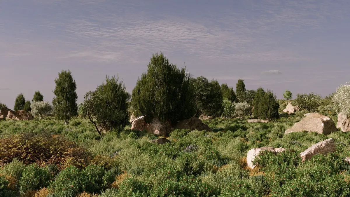 Highly Realistic Flora: Immerse your renders in lifelike detail. Our collection includes a variety of meticulously crafted Mediterranean plant species, capturing the unique character and density of true maquis shrubland. (Bitki türlerini detaylandırmak isterseniz buraya ekleyebilirsiniz, örneğin: Kermes Oak, Myrtle, Laurel, etc.)