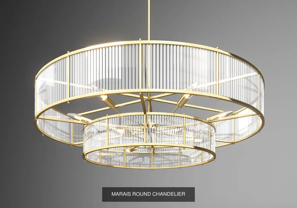 A study in 1960s French minimalism, our tiered chandelier features shimmering curtains of vertical glass rods edged with bands of solid polished brass. The richly textured surface refracts the light, casting a warm, diffuse glow.