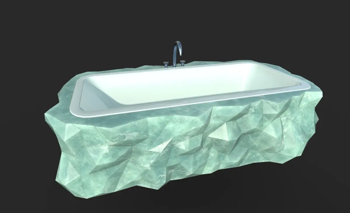 This 3D model features a luxurious bathtub embedded in a rugged, marble-like rock base. The smooth, glossy tub contrasts beautifully with the raw, jagged stone exterior, complemented by sleek metal fixtures for an elegant, natural aesthetic. Contains substance painter file to change the textures. Includes 3 color variations.