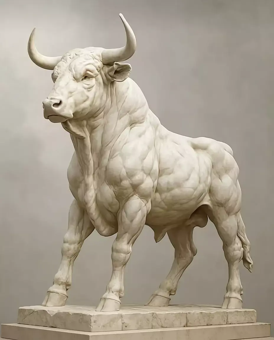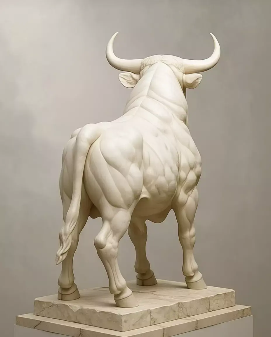 The surface texture mimics real marble, with subtle veining, soft highlights, and a smooth, polished finish that reflects light beautifully, enhancing the three-dimensional form. The sculpture rests on a simple stone plinth, grounding it in classical tradition and emphasizing its grandeur. This piece draws inspiration from ancient Greek and Roman art, where the bull symbolized fertility, sacrifice, strength, and divine power—making it a timeless emblem in mythology, agriculture, and finance (as seen in stock market symbolism).