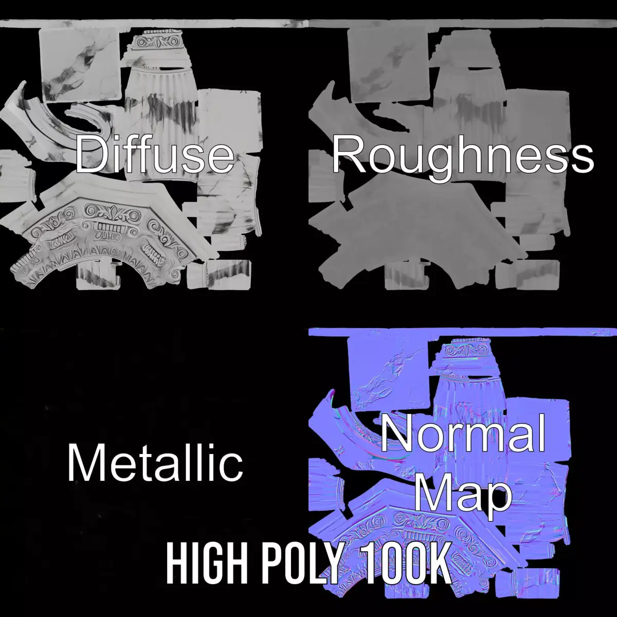The Marble Ionic Column model pack features a detailed representation of classical architecture, complete with iconic volutes and fluted shafts. Each model is available in three levels of detail—low-poly for mobile applications, middle-poly for environment designs, and high-poly for production rendering in software like 3ds Max and Blender. This versatility makes it perfect for a range of applications such as historical reconstructions, architectural visualizations, and interactive presentations.